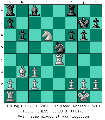 Last move : 0-1 2012 March 18 21:24:39 [Event "FICGS__CHESS__CLASS_D__000178"] [Site "FICGS"] [Date "2011.12.29"] [Round "1"] [White "Tuluoglu,Utku"] [Black "Toutaoui,Khaled"] [Result "0-1"] [WhiteElo "1598"] [BlackElo "1528"] 1.e4 c5 2.Nf3 d6 3.d4 cxd4 4.Nxd4 Nf6 5.Nc3 Nc6 6.Bg5 g6 7.Bxf6 exf6 8.Be2 Bg7 9.O-O O-O 10.Ndb5 f5 11.Qxd6 Qxd6 12.Nxd6 Bxc3 13.bxc3 fxe4 14.Bc4 Ne5 15.Bb3 b6 16.Rfe1 Kg7 17.Rxe4 f6 0-1 Sicilian : Richter-Rauzer, Bondarevsky variation Kingside Castling by player White (move 9) Kingside Castling by player Black (move 9) Player Black won this chess game. Follow this game move after move (download)I have always a slight feeling of pity for the man who has no knowledge of Chess. (Siegbert Tarrasch) Dass jemand wie Surab Asmaiparaschwili, der selbst Elopunkte gekauft hat , Vize-Präsident der Fide werden konnte, sagt schon einges über den Zustand dieser Organisation aus. (Joel Lautier) Todos los Maestros de Ajedrez fueron un día unos principiantes. (Chernev) Un footballeur joue avec ses pieds, parfois avec sa tête. Un joueur d'échecs ne joue qu'avec sa tête. Et quand il ne joue plus, il meurt. (Jacob Murray) Only sick music makes money today. (Friedrich Nietzsche)