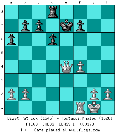 Last move : 1-0 2012 March 11 11:56:43 [Event "FICGS__CHESS__CLASS_D__000178"] [Site "FICGS"] [Date "2011.12.29"] [Round "1"] [White "Bizet,Patrick"] [Black "Toutaoui,Khaled"] [Result "1-0"] [WhiteElo "1546"] [BlackElo "1528"] 1.e4 e5 2.Nf3 Nc6 3.Bb5 d6 4.d4 exd4 5.Nxd4 Bd7 6.O-O Nf6 7.Nc3 Be7 8.f4 O-O 9.Be3 Nxd4 10.Bxd7 Nxc2 11.Qxc2 Qxd7 12.Rad1 Qc6 13.Qd3 Rfe8 14.Bd4 Rad8 15.Rde1 Bf8 16.Re3 a6 17.Bxf6 gxf6 18.Rg3+ Bg7 19.Qf3 Kh8 20.Nd5 Qd7 21.Rxg7 Kxg7 22.Qg3+ Kf8 23.Nxf6 Qe6 24.Qg5 Ke7 25.Nxe8 Kxe8 26.Qg8+ Ke7 27.Qxh7 Qxe4 28.Qxe4+ 1-0 Ruy Lopez : Old Steinitz defense Kingside Castling by player White (move 6) Kingside Castling by player Black (move 8) Player White won this chess game. Follow this game move after move (download)The way he plays Chess demonstrates a man's whole nature. (Stanley Ellin) Ich kenne Menschen, die allen Willen der Welt besitzen und doch nicht Schach spielen können. (Robert James Fischer) El jugador de combinación piensa hacia adelante; comienza de la posición dada y trabaja las movidas contundentes en su mente. (Emanuel Lasker) Le succès, c'est être capable d'aller d'échec en échec sans perdre son enthousiasme. (Winston Churchill) Difficult things take a long time, impossible things a little longer. (Author unknown)