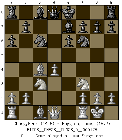 Last move : 0-1 2012 March 31 22:58:3 [Event "FICGS__CHESS__CLASS_D__000178"] [Site "FICGS"] [Date "2011.12.29"] [Round "1"] [White "Chang,Henk"] [Black "Huggins,Jimmy"] [Result "0-1"] [WhiteElo "1445"] [BlackElo "1577"] 1.Nf3 d5 2.d4 Nf6 3.e3 e6 4.Bd3 c5 5.c4 Nc6 6.O-O a6 7.Nc3 dxc4 8.Bxc4 cxd4 9.exd4 Be7 0-1 This chess game has been lost on time (started : 2011.12.29 11:58:48) Reti Opening Kingside Castling by player White (move 6) Player Black won this chess game. Follow this game move after move (download)Let the perfectionist play postal. (Yasser Seirawan) Wenn Capablanka heute auf der Schachbühne erscheinen würde, hätte er ein halbes Jahr gebraucht um sich die Schachtheorie anzueignen. Und dann hätte er alles und jeden besiegt. (Mikhail Moiseyevich Botvinik) Yo he agregado estos principios a la ley: pongan los Caballos en acción antes de que los dos Alfiles sean desarrollados. (Emanuel Lasker) Roi des jeux et jeu des rois, les échecs portent en eux un sentiment d'infini. Ils donnent à celui qui s'est efforcé d'en approfondir les arcanes l'impression de n'être pas à la mesure de l'homme; en fait, ils constituent un résumé de l'univers, un microcosme, et figurent cette grande échelle qui, dans les plans de la lumière descend jusqu'à la matière, qui des abîmes insondables remonte jusqu'en l'infini de Dieu. (Pyrame) We cannot be sure of having something to live for unless we are willing to die for it. (Ernesto Che Guevara)