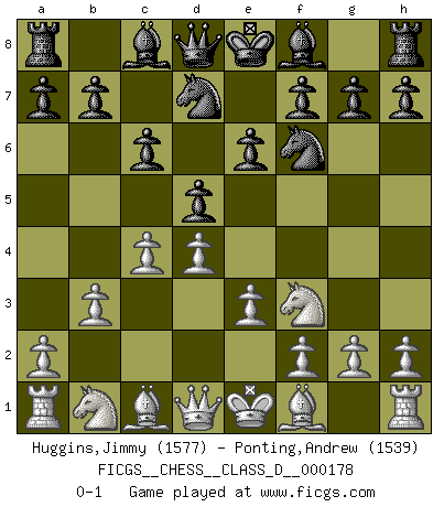 Last move : 0-1 2012 March 29 9:49:25 [Event "FICGS__CHESS__CLASS_D__000178"] [Site "FICGS"] [Date "2011.12.29"] [Round "1"] [White "Huggins,Jimmy"] [Black "Ponting,Andrew"] [Result "0-1"] [WhiteElo "1577"] [BlackElo "1539"] 1.d4 d5 2.c4 c6 3.Nf3 Nf6 4.e3 e6 5.b3 Nbd7 0-1 QGD Slav : 4.e3 Player Black won this chess game. Follow this game move after move (download)Many Chess players were surprised when after the game, Fischer quietly explained: 'I had already analyzed this possibility' in a position which I thought was not possible to foresee from the opening. (Mikhail Tal) Ein Isolani verdüstert die Stimmung auf dem ganzen Schachbrett. (Savielly Grigorievitsch Tartakower) El Ajedrez es 99 por ciento táctica. (Teichmann) Tout change constamment, y compris dans le monde des Echecs. (Botvinnik) When you stop learning you start dying. (Scott Adams)