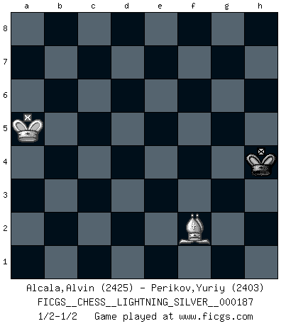 Last move : 1/2-1/2 2011 December 30 16:49:52 [Event "FICGS__CHESS__LIGHTNING_SILVER__000187"] [Site "FICGS"] [Date "2011.12.30"] [Round "1"] [White "Alcala,Alvin"] [Black "Perikov,Yuriy"] [Result "1/2-1/2"] [WhiteElo "2425"] [BlackElo "2403"] 1.e4 c5 2.Nf3 d6 3.d4 cxd4 4.Nxd4 Nf6 5.Nc3 a6 6.Be3 e5 7.Nb3 Be6 8.Be2 Be7 9.Nd5 Nxd5 10.exd5 Bf5 11.Qd2 O-O 12.O-O Nd7 13.Na5 Qc7 14.c4 Bg6 15.b4 f5 16.f3 Nf6 17.Bf2 e4 18.f4 Rac8 19.Nb3 Ng4 20.Bd4 Qd7 21.Rac1 Rfe8 22.h3 Nf6 23.Be3 Nh5 24.Qe1 Nf6 25.Nd4 Bd8 26.g4 fxg4 27.f5 g3 28.Qxg3 Bh5 29.Bxh5 Nxh5 30.Qg2 Bf6 31.Qg4 Qf7 32.Ne6 Be5 33.Rf2 Nf6 34.Qh4 Qh5 35.Qxh5 Nxh5 36.a4 Kf7 37.a5 Re7 38.c5 h6 39.c6 Kf6 40.Kg2 bxc6 41.Rxc6 Rb8 42.Rb6 Rc8 43.Bd2 Bg3 44.Re2 g5 45.fxg6 Ke5 46.Bxh6 Kxd5 47.Ng7 Nxg7 48.Kxg3 Nf5+ 49.Kf4 Nd4 50.Rd2 e3 51.Rxd6+ Kxd6 52.Rxd4+ Ke6 53.Re4+ Kd7 54.Rxe3 Rxe3 55.Kxe3 Ke6 56.Kd4 Kf5 57.g7 Kg6 58.Bf4 Kxg7 59.Kd5 Kf6 60.h4 Kg6 61.Bd6 Kh5 62.Be7 Rb8 63.Kc6 Kh6 64.Bd6 Rb5 65.Bc5 Kh5 66.Bb6 Rxb4 67.Kb7 Rb5 68.Kxa6 Rxa5+ 69.Kxa5 Kxh4 70.Bf2+ 1/2-1/2 Sicilian : Najdorf, Byrne (English) attack Kingside Castling by player Black (move 11) Kingside Castling by player White (move 12) 10 pieces endgame at move 54 : White KBPPPP , Black KRRP WHITE : King + 1 Bishop 4 Pawns BLACK : King + 2 Rooks 1 Pawn 9 pieces endgame at move 55 : White KBPPPP , Black KRP WHITE : King + 1 Bishop 4 Pawns BLACK : King + 1 Rook 1 Pawn 8 pieces endgame at move 58 : White KBPPP , Black KRP WHITE : King + 1 Bishop 3 Pawns BLACK : King + 1 Rook 1 Pawn 7 pieces endgame at move 66 : White KBPP , Black KRP WHITE : King + 1 Bishop 2 Pawns BLACK : King + 1 Rook 1 Pawn 6 pieces endgame at move 68 : White KBPP , Black KR WHITE : King + 1 Bishop 2 Pawns BLACK : King + 1 Rook 5 pieces endgame at move 68 : White KBP , Black KR WHITE : King + 1 Bishop 1 Pawn BLACK : King + 1 Rook 4 pieces endgame at move 69 : White KBP , Black K WHITE : King + 1 Bishop 1 Pawn BLACK : King + 3 pieces endgame at move 69 : White KB , Black K WHITE : King + 1 Bishop BLACK : King + This chess game ended in a draw. Follow this game move after move (download)Best by test: 1. e4 (Bobby Fischer) Was ist der Unterschied zwischen einem Strassenarbeiter und einem Schachspieler? --Der Schachspieler bewegt sich ab und zu. (Anonymous) El Ajedrez por encima de todo... ¡es una pelea!. (Emanuel Lasker) Les Echecs sont affaire de jugement sensible. Savoir quand frapper et quand esquiver. (Fischer) Drag your thoughts away from your troubles... by the ears, by the heels, or any other way you can manage it. (Mark Twain)
