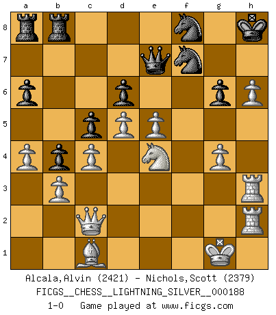 Last move : 1-0 2011 December 31 19:3:34 [Event "FICGS__CHESS__LIGHTNING_SILVER__000188"] [Site "FICGS"] [Date "2011.12.31"] [Round "1"] [White "Alcala,Alvin"] [Black "Nichols,Scott"] [Result "1-0"] [WhiteElo "2421"] [BlackElo "2379"] 1.e4 e5 2.Nf3 Nc6 3.Bb5 a6 4.Ba4 Nf6 5.O-O Be7 6.Re1 b5 7.Bb3 d6 8.c3 O-O 9.h3 Na5 10.Bc2 c5 11.d4 Qc7 12.d5 Ne8 13.b3 Nb7 14.a4 b4 15.c4 f5 16.exf5 Bxf5 17.Bxf5 Rxf5 18.Nbd2 Nd8 19.Ne4 Rf8 20.Ra2 Nf6 21.Ng3 Nf7 22.Qd3 Kh8 23.h4 Ng8 24.Ne4 Qd7 25.Nfg5 Bxg5 26.hxg5 Ne7 27.Re3 Ng6 28.Rh3 Kg8 29.f3 Rfb8 30.g4 Nf8 31.Rah2 Qe7 32.Qc2 h6 33.gxh6 g6 34.f4 Kh8 35.fxe5 1-0 Ruy Lopez : Closed Kingside Castling by player White (move 5) Kingside Castling by player Black (move 8) Player White won this chess game. Follow this game move after move (download)Life is a kind of Chess, with struggle, competition, good and ill events. (Benjamin Franklin) Schachspieler können ausgezeichnet Varianten am Schachbrett berechnen, aber nicht im realen Leben. Zu stark ist der Individualismus im Schach ausgeprägt, und für viele ist ein kleiner momentaner persönlicher Vorteil wichtiger als ein weit größerer Vorteil von morgen. (Anatoly Karpov) No es una movida, aún la mejor movida que tu debas buscar, sino un plan comprensible. (Eugene Znosko-Borovsky) Le génie consiste à savoir transgresser les règles au moment opportun. (Teichmann) Lottery : A tax on people who are bad at math. (Author unknown)