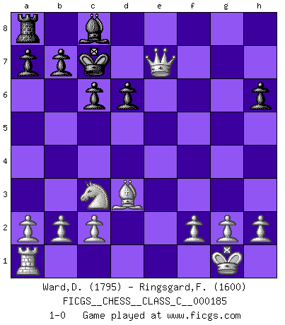 Last move : 1-0 2012 February 13 15:32:7 [Event "FICGS__CHESS__CLASS_C__000185"] [Site "FICGS"] [Date "2012.01.01"] [Round "1"] [White "Ward,David"] [Black "Ringsgard,Fredrik Hasle"] [Result "1-0"] [WhiteElo "1795"] [BlackElo "1600"] 1.e4 e5 2.Nf3 Nc6 3.Bb5 Bd6 4.Nc3 g6 5.O-O f5 6.d4 Nge7 7.Bg5 h6 8.Bf6 Rh7 9.exf5 gxf5 10.dxe5 Nxe5 11.Nxe5 Bxe5 12.Qh5+ Kf8 13.Bxe5 Qe8 14.Qf3 c6 15.Bd3 Qf7 16.Bd6 Ke8 17.Rfe1 Kd8 18.Bxe7+ Qxe7 19.Rxe7 Rxe7 20.Qxf5 d6 21.Qf8+ Kc7 22.Qxe7+ 1-0 Ruy Lopez (Spanish Opening) Kingside Castling by player White (move 5) Player White won this chess game. Follow this game move after move (download)Chess is everything: art, science and sport. (Anatoly Karpov) Korrekt heißt in Deutschland die Haltung eines Mannes, dessen Benehmen nach dem Urteile seiner Nachbarn seiner Stellung angemessen ist. Um korrekt zu sein, muß man sich der Meinung der anderen anpassen... (Emanuel Lasker) Con o sin el título, Bobby Fischer fue sin lugar a dudas el mas grande jugador de su época. (Burt Hochberg) J'ai vu le vaincu d'Echecs jouer des années durant dans l'espoir de la fête de la victoire. Car tu es plus riche de ce qu'elle existe si même elle n'est point pour toi. Ainsi de la perle du fond des mers. (Antoine de Saint-Exupéry) I don't diet. I just don't eat as much as I'd like to. (Linda Evangelista, supermodel)