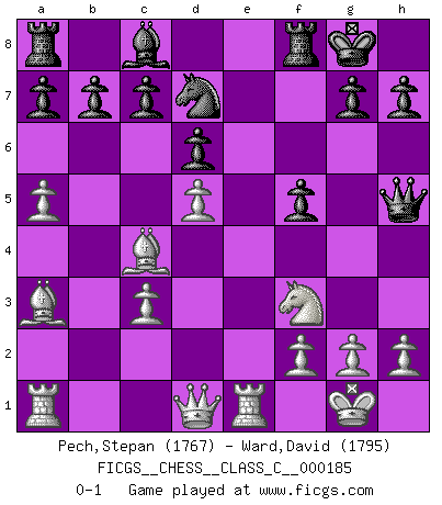 Last move : 0-1 2012 June 6 15:22:44 [Event "FICGS__CHESS__CLASS_C__000185"] [Site "FICGS"] [Date "2012.01.01"] [Round "1"] [White "Pech,Stepan"] [Black "Ward,David"] [Result "0-1"] [WhiteElo "1767"] [BlackElo "1795"] 1.e4 e5 2.Bc4 Nc6 3.Nf3 Bc5 4.c3 Qe7 5.d4 Bb6 6.O-O d6 7.a4 Nf6 8.d5 Nb8 9.a5 Bc5 10.b4 Nxe4 11.bxc5 Nxc5 12.Ba3 Nbd7 13.Re1 O-O 14.Nbd2 f5 15.Nxe5 Qh4 16.Ndf3 Qh5 17.Nxd7 Nxd7 0-1 This chess game has been lost on time (started : 2012.01.01 2:25:47) Bishop's Opening Kingside Castling by player White (move 6) Kingside Castling by player Black (move 13) Player Black won this chess game. Follow this game move after move (download)One of these modest little moves may be more embarrassing to your opponent than the biggest threat. (Siegbert Tarrasch) Modernes Schach erfordert enorme Anspannung. Es ist für einen normalen Menschen unmöglich das auszuhalten. (Viktor Kortschnoi) El juego de Damas es para vagabundos. (Paul Morphy) Il vaut mieux sacrifier les pièces de l'adversaire. (Xavier Tartacover) I would love to change the world, but they won't give me the source code. (Unknown)