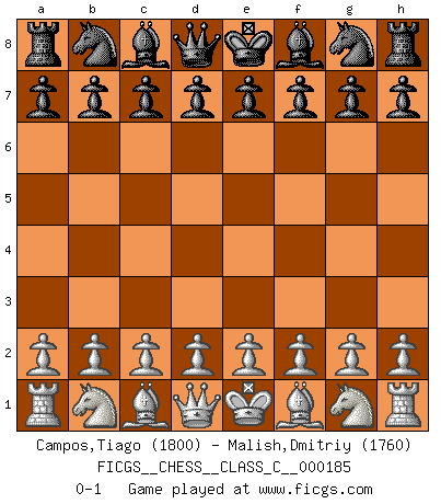 Last move : 0-1 2012 February 10 7:21:15 [Event "FICGS__CHESS__CLASS_C__000185"] [Site "FICGS"] [Date "2012.01.01"] [Round "1"] [White "Campos,Tiago"] [Black "Malish,Dmitriy"] [Result "0-1"] [WhiteElo "1800"] [BlackElo "1760"] 0-1 This chess game has been lost on time (started : 2012.01.01 2:25:47) Player Black won this chess game. Follow this game move after move (download)I look one move ahead... the best ! (Siegbert Tarrasch) Ich möchte Schüler heranbilden, die das Vermögen haben, selbst zu denken und Kritik zu üben. (Emanuel Lasker) Personalmente, yo prefiero mirar hacia el futuro en donde un programa de computadora gane el título mundial de Ajedrez. La humanidad necesita una lección de humildad. (Richard Dawkings) On est toujours la mazette de quelqu'un d'autre. (Anonyme) Now be brave and don't look back. Don't look back. (Shmi Skywalker in Star Wars ep.1)