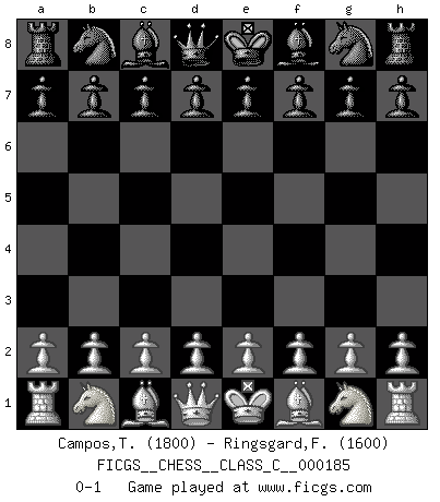 Last move : 0-1 2012 February 10 7:21:15 [Event "FICGS__CHESS__CLASS_C__000185"] [Site "FICGS"] [Date "2012.01.01"] [Round "1"] [White "Campos,Tiago"] [Black "Ringsgard,Fredrik Hasle"] [Result "0-1"] [WhiteElo "1800"] [BlackElo "1600"] 0-1 This chess game has been lost on time (started : 2012.01.01 2:25:47) Player Black won this chess game. Follow this game move after move (download)Chess is a fairy tale of 1001 blunders. (Savielly Tartakower) Wie bekannt hörte Morphy 1859 auf, Schach zu spielen. Seine Enttäuschung galt nicht so sehr dem Schach, wie den Schachspielern. (Robert James Fischer) La enorme capacidad mental, en la que sin ella no puede un jugador de Ajedrez existir, es demasiado requerida por el Ajedrez al grado de que nunca podrá liberar su mente de este juego. (Albert Einstein) La conception d'un plan est le processus par lequel un joueur exploite les avantages de sa position tout en s'efforçant d'en réduire au minimum les inconvénients. Afin de garantir le succès, un plan doit toujours se fonder sur un diagnostic objectif des particularités d'une position. La conception d'un plan est d'autant plus difficile que la position est équilibrée, et grandement facilitée lorsqu'il n'existe qu'un seul plan susceptible de répondre aux exigences de la position. (Harry Golombek) Macintosh - we might not get everything right, but at least we knew the century was going to end. (Douglas Adams)