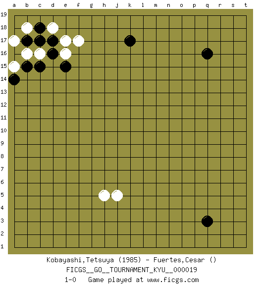Last move : 1-0 2007 March 2 12:15:49 [Event "FICGS__GO__TOURNAMENT_KYU__000019"] [Site "FICGS"] [Date "2007.01.11"] [Round "1"] [Black "Kobayashi,Tetsuya"] [White "Fuertes,Cesar"] [Result "1-0"] [Rating 1 "1985"] 1.q16 h5 2.q3 j5 3.c17 c16 4.d16 e16 5.c15 b16 6.d17 e17 7.e15 d18 8.k17 f17 9.c18 b18 10.b15 a15 11.b17 a17 12.a14 1-0 This go game has been lost on time (started : 2007.01.11 13:9:38) Here are the names of the openings (joseki) played in the four corners : Corner d16 : c17 c16 San-San (Sam-Sam, San-San) 3-3 Point. The San-San (3-3) point, emphasizing territory at the expense of influence. This move is not recommended. White should envisage 4-4, 5-3, 6-4, 5-4 or 6-3 instead. Player Black won this Go (weiqi, baduk) game. Follow this game move after move (download)Dead group ? Always win ko fights ! (Anonymous) The right perception of any matter and a misunderstanding of the same matter do not wholly exclude each other. (Kafka's the trial)