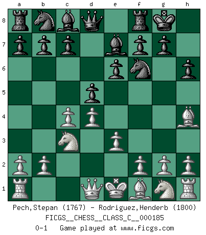 Last move : 0-1 2012 April 13 23:42:47 [Event "FICGS__CHESS__CLASS_C__000185"] [Site "FICGS"] [Date "2012.01.01"] [Round "1"] [White "Pech,Stepan"] [Black "Rodriguez,Henderb"] [Result "0-1"] [WhiteElo "1767"] [BlackElo "1800"] 1.c4 e6 2.Nc3 d5 3.d4 Nf6 4.Bg5 Be7 5.e3 h6 6.Bh4 O-O 0-1 This chess game has been lost on time (started : 2012.01.01 2:25:47) English Opening Kingside Castling by player Black (move 6) Player Black won this chess game. Follow this game move after move (download)No one ever won a game by resigning. (Unknown) Die FIDE ist dabei in die Hände der russischen Mafia zu fallen. (Larry Evans) Bobby es la celebridad menos entendida y malinterpretada que camina el la faz de esta tierra. (Yasser Seirawan) Le génie consiste à savoir transgresser les règles au moment opportun. (Teichmann) True nature is revealed in times of difficulty. (Chinese proverb)
