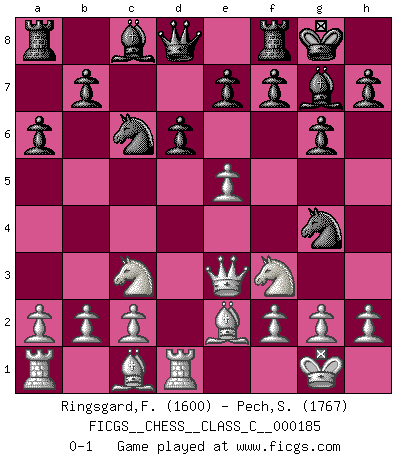 Last move : 0-1 2012 April 29 0:18:39 [Event "FICGS__CHESS__CLASS_C__000185"] [Site "FICGS"] [Date "2012.01.01"] [Round "1"] [White "Ringsgard,Fredrik Hasle"] [Black "Pech,Stepan"] [Result "0-1"] [WhiteElo "1600"] [BlackElo "1767"] 1.e4 c5 2.d4 cxd4 3.Qxd4 Nc6 4.Qe3 Nf6 5.Nf3 d6 6.Be2 a6 7.O-O g6 8.Nc3 Bg7 9.Rd1 O-O 10.e5 Ng4 0-1 Sicilian : Smith-Morra gambit Kingside Castling by player White (move 7) Kingside Castling by player Black (move 9) Player Black won this chess game. Follow this game move after move (download)The way he plays Chess demonstrates a man's whole nature. (Stanley Ellin) In der Schule lernt man nichts. Es ist nur Zeitverschwendung. (Robert James Fischer) Nos gusta pensar. (Gary Kasparov) Les Cavaliers se révèlent fort utiles dans les positions fermées. D'habitude, les Fous sont un peu plus forts que les Cavaliers dans les positions ouvertes. Qu'on le veuille ou non, il restera toujours des exceptions ! Beep ! (R2D2 in Star Wars ep.3)