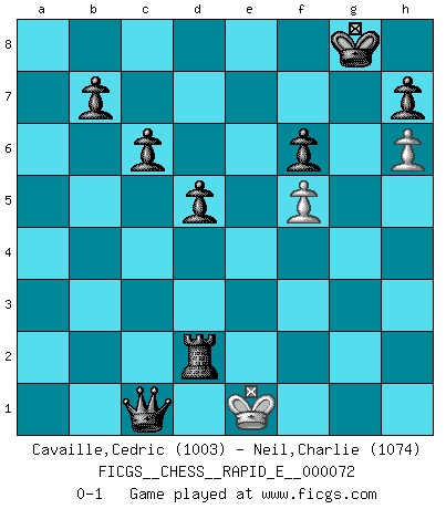 Last move : 0-1 2012 January 18 16:34:32 [Event "FICGS__CHESS__RAPID_E__000072"] [Site "FICGS"] [Date "2012.01.01"] [Round "1"] [White "Cavaille,Cedric"] [Black "Neil,Charlie"] [Result "0-1"] [WhiteElo "1003"] [BlackElo "1074"] 1.e4 e6 2.Nf3 d5 3.exd5 exd5 4.d4 Bd6 5.Nc3 c6 6.Bd3 Ne7 7.Ng5 Nd7 8.Nf3 O-O 9.O-O f6 10.a3 Re8 11.b4 a6 12.Ne2 Nf8 13.c3 Be6 14.Bf4 Neg6 15.Bxd6 Qxd6 16.Ng5 Bg4 17.Bxg6 Nxg6 18.f3 Bf5 19.Nh3 Bxh3 20.gxh3 Re3 21.Qe1 Rae8 22.Ra2 Nf4 23.Qg3 Nxe2+ 24.Rxe2 Qxg3+ 25.hxg3 Rxe2 26.Rf2 Re1+ 27.Rf1 Rxf1+ 28.Kxf1 Re3 29.Kf2 Rxc3 30.g4 Rxa3 31.Kg3 Ra4 32.f4 Rxb4 33.h4 a5 34.g5 a4 35.gxf6 gxf6 36.Kg4 a3 37.f5 a2 38.h5 a1Q 39.h6 Rxd4+ 40.Kf3 Qc3+ 41.Ke2 Rd2+ 42.Ke1 Qc1+ 0-1 French defense Kingside Castling by player Black (move 8) Kingside Castling by player White (move 9) Promotion Queen by player Black (move 38) Player Black won this chess game. Follow this game move after move (download)Chess is a terrible game. If you have no center, your opponent has a freer position. If you do have a center, then you really have something to worry about ! (Siegbert Tarrasch) Der vorletzte Fehler gewinnt. (Savielly Grigorievitsch Tartakower) Debemos de asegurarnos de que el Ajedrez no se convierta en un lenguaje muerto, muy interesante, pero solo para un grupo muy pequeño. (Sytze Faber) On a dit que l'homme se distingue de l'animal par le fait qu'il achète plus de livres qu'il ne peut en lire. Je voudrais suggérer qu'inclure à la liste des livres quelques livres d'échecs rendrait la distinction manifeste. (Edward Lasker) May I never be complete. May I never be content. May I never be perfect. Deliver me, Tyler, from being perfect and complete. (Chuck Palahniuk, Fight Club)