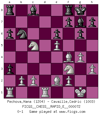 Last move : 0-1 2012 March 14 17:17:51 [Event "FICGS__CHESS__RAPID_E__000072"] [Site "FICGS"] [Date "2012.01.01"] [Round "1"] [White "Pechova,Hana"] [Black "Cavaille,Cedric"] [Result "0-1"] [WhiteElo "1204"] [BlackElo "1003"] 1.d4 g6 2.e4 d6 3.Nc3 Bg7 4.Nf3 Nf6 5.Be2 O-O 6.O-O Nbd7 7.e5 dxe5 8.dxe5 Nh5 9.g4 Nf4 10.Bxf4 c6 11.h3 b5 12.Qd4 e6 13.Rfd1 a6 14.Ne4 Qb6 15.Qd6 c5 16.Qxb6 Nxb6 17.Nxc5 b4 18.a3 bxa3 0-1 Modern defense Kingside Castling by player Black (move 5) Kingside Castling by player White (move 6) Player Black won this chess game. Follow this game move after move (download)Bobby just drops the pieces and they fall on the right squares. (Miguel Najdorf) Früher wurde jeder komplizierte Zug, jedes interessante Opfer mit großem Beifall und Enthusiasmus aufgenommen. Heute schaltet man einfach seinen Fritz an, und man kann sehen, was los ist, ob der Zug geht oder nicht. (Vladimir Kramnik) Las leyes del Ajedrez no permiten una libre elección: tienes que mover quieras o no. (Emanuel Lasker) Plusieurs personnes se sont demandées comment Tal faisait pour gagner... En fait, c'est très simple ! Il met ses pièces au centre de l'échiquier et les sacrifie quelque part ! (David Bronstein) The existence of forgetting has never been proved: We only know that some things don't come to mind when we want them. (Friedrich Nietzsche)