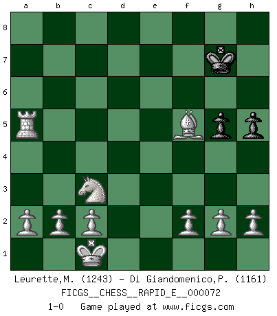 Last move : 1-0 2012 January 17 11:7:24 [Event "FICGS__CHESS__RAPID_E__000072"] [Site "FICGS"] [Date "2012.01.01"] [Round "1"] [White "Leurette,Marc-Antoine"] [Black "Di Giandomenico,Pierino"] [Result "1-0"] [WhiteElo "1243"] [BlackElo "1161"] 1.e4 e5 2.Nf3 Nf6 3.Nc3 Bc5 4.Bc4 O-O 5.d4 exd4 6.Nxd4 Qe7 7.Bg5 Nc6 8.Nf5 Nxe4 9.Nxe7+ Kh8 10.Nxe4 Bxe7 11.Bxe7 Nxe7 12.Qf3 f5 13.Nc3 d6 14.O-O-O c6 15.Rxd6 b5 16.Be6 Rf6 17.Rd8+ Ng8 18.Bxg8 Bb7 19.Rhd1 Rxd8 20.Rxd8 g6 21.Bb3 Kg7 22.Rd7+ Kh8 23.Rxb7 a5 24.Qxc6 Rxc6 25.Rb8+ Kg7 26.Rxb5 Re6 27.Bxe6 h5 28.Rxa5 g5 29.Bxf5 1-0 Petrov Three knights game Kingside Castling by player Black (move 4) Queenside Castling by player White (move 14) Player White won this chess game. Follow this game move after move (download)You can only get good at Chess if you love the game. (Bobby Fischer) Als ich elf wurde, wurde ich einfach gut. (Robert James Fischer) El Ajedrez lo es todo: arte, ciencia y deporte. (Anatoly Karpov) Les échecs sont un jeu terrible. Si vous n'avez pas le centre, votre adversaire a une position plus libre. Par contre, si vous avez le centre, alors vous avez vraiment quelque chose pour laquelle vous inquiéter ! (Siegbert Tarrasch) Warrior pose battles inner weakness and wins focus. You see that there is no war within you. You're on your own side, and you are your own strength. (Terri Guillemets)