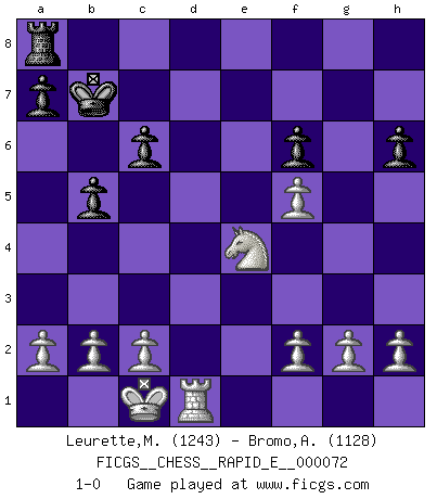 Last move : 1-0 2012 January 6 18:13:23 [Event "FICGS__CHESS__RAPID_E__000072"] [Site "FICGS"] [Date "2012.01.01"] [Round "1"] [White "Leurette,Marc-Antoine"] [Black "Bromo,Alexis"] [Result "1-0"] [WhiteElo "1243"] [BlackElo "1128"] 1.e4 e5 2.Nf3 Nc6 3.Bc4 h6 4.d4 d6 5.dxe5 Nxe5 6.Nxe5 dxe5 7.Qxd8+ Kxd8 8.Be3 Bd6 9.Bxf7 Nf6 10.Nc3 c6 11.O-O-O Kd7 12.Bg6 b5 13.Bc5 Kc7 14.Bxd6+ Kb7 15.Bxe5 Be6 16.Bf5 Bxf5 17.exf5 Rhd8 18.Bxf6 Rxd1+ 19.Rxd1 gxf6 20.Ne4 1-0 King's pawn game Queenside Castling by player White (move 11) Player White won this chess game. Follow this game move after move (download)Some sacrifices are sound; the rest are mine. (Mikhail Tal) Man gibt nur Pakete auf. (Paul Keres) Aquellos que dicen que entienden al Ajedrez, no entienden nada. (Robert Hubner) Nous vivons dans un monde échiquéen : chaque jour qui passe est un défi à relever. (Philosophe Sasha) Creativity is allowing yourself to make mistakes. Art is knowing which ones to keep. (Scott Adams)