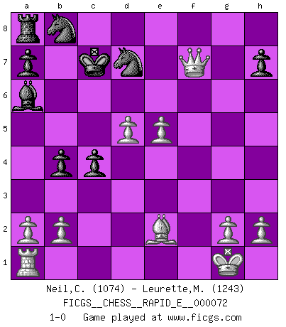 Last move : 1-0 2012 January 10 17:18:14 [Event "FICGS__CHESS__RAPID_E__000072"] [Site "FICGS"] [Date "2012.01.01"] [Round "1"] [White "Neil,Charlie"] [Black "Leurette,Marc-Antoine"] [Result "1-0"] [WhiteElo "1074"] [BlackElo "1243"] 1.d4 d5 2.c4 dxc4 3.Nc3 e6 4.Bf4 Bd6 5.Bxd6 cxd6 6.e4 d5 7.Be2 Nf6 8.e5 Nfd7 9.f4 f6 10.Nf3 fxe5 11.fxe5 Qa5 12.O-O b5 13.Ng5 Rf8 14.Nxe6 Rxf1+ 15.Qxf1 b4 16.Nxg7+ Kd8 17.Ne6+ Ke7 18.Nc7 Qxc7 19.Nxd5+ Kd8 20.Nxc7 Kxc7 21.Qf7 Ba6 22.d5 1-0 Queen's gambit accepted Kingside Castling by player White (move 12) Player White won this chess game. Follow this game move after move (download)A good sacrifice is one that is not necessarily sound but leaves your opponent dazed and confused. (Rudolph Spielmann) Das Schachspiel hat wie die Liebe, die Musik, die Fähigkeit, den Menschen glücklich zu machen. Ich habe ein leises Gefühl des Bedauerns für jeden, der das Schachspiel nicht kennt, so wie ich jeden bedaure, der die Liebe nicht kennt. (Siegbert Tarrasch) Ser exitoso en el Ajedrez te permite descubrir tu propia personalidad. Eso es lo que deseo para los niños de mi clase. (Saudin Robovic) Les échecs sont utiles à l'exercice de la faculté de penser et à celle de l'imagination. Car nous devons posséder une méthode élaborée pour atteindre des buts partout où nous devons conduire notre raison. (Leibnitz) Big Chess is a place for big hallucinations. (Thibault de Vassal)
