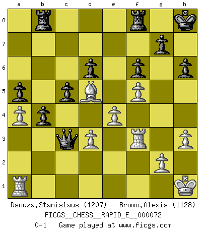 Last move : 0-1 2012 February 28 19:59:37 [Event "FICGS__CHESS__RAPID_E__000072"] [Site "FICGS"] [Date "2012.01.01"] [Round "1"] [White "Dsouza,Stanislaus"] [Black "Bromo,Alexis"] [Result "0-1"] [WhiteElo "1207"] [BlackElo "1128"] 1.e4 e5 2.Nf3 Nc6 3.Bc4 h6 4.d3 Nf6 5.Nc3 Bb4 6.Bd2 d6 7.Nd5 Bxd2+ 8.Nxd2 a6 9.O-O Bg4 10.h3 Bxd1 11.Rfxd1 O-O 12.Nf3 b5 13.Bb3 Nd4 14.Nxd4 exd4 15.f4 c6 16.Nxf6+ Qxf6 17.f5 c5 18.Kh2 Qe5+ 19.Kh1 a5 20.a4 b4 21.Bd5 Rab8 22.Rf1 Kh8 23.Rf3 f6 24.c4 dxc3 25.bxc3 Qxc3 0-1 This chess game has been lost on time (started : 2012.01.01 2:29:27) King's pawn game Kingside Castling by player White (move 9) Kingside Castling by player Black (move 11) Player Black won this chess game. Follow this game move after move (download)Chess books should be used as we use glasses: to assist the sight, although some players make use of them as if they thought they conferred sight. (Jose Raul Capablanca) Sie führen leise Selbstgespräche, schlürfen lautstark ihre Getränke, schmatzen hörbar beim Essen, blasen ihrem Gegenüber Rauch in die Augen, niesen ihm ins Gesicht, starren ihn unverwandt an, bis er sich unter ihren Blicken windet, rutschen ständig auf ihrem Stuhl hin und her, rülpsen und bohren in der Nase. (Anonymous) La partida mas dura de ganar es una partida ganada. (Emanuel Lasker) C'est la seule position que je connaisse où les deux camps sont mals. Propos prêtés à V. Anand. To steal ideas from one person is plagiarism. To steal from many is research. (Unknown)