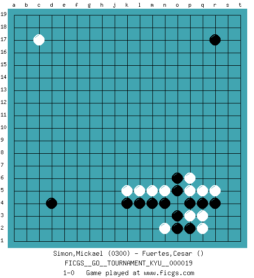 Last move : 1-0 2007 March 4 0:25:34 [Event "FICGS__GO__TOURNAMENT_KYU__000019"] [Site "FICGS"] [Date "2007.01.11"] [Round "1"] [Black "Simon,Mickael"] [White "Fuertes,Cesar"] [Result "1-0"] [Rating 1 "0300"] 1.r17 c17 2.r4 r5 3.q4 q5 4.p4 p5 5.d4 p3 6.o3 q3 7.p2 q2 8.o2 n2 9.o5 n5 10.o6 p6 11.n4 m5 12.m4 l5 13.l4 k5 14.k4 1-0 This go game has been lost on time (started : 2007.01.11 13:9:38) Here are the names of the openings (joseki) played in the four corners : Corner q4 : r4 r5 Komoku (Somok, Xiao~mu`) 3-4 Point. The komoku (3-4) point is the traditional corner enclosure move.. Player Black won this Go (weiqi, baduk) game. Follow this game move after move (download)Very few good moves are played. (Pierre Audouard) Children in the dark cause accidents, accidents in the dark cause children. (Unknown)
