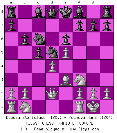 Last move : 1-0 2012 March 14 17:17:58 [Event "FICGS__CHESS__RAPID_E__000072"] [Site "FICGS"] [Date "2012.01.01"] [Round "1"] [White "Dsouza,Stanislaus"] [Black "Pechova,Hana"] [Result "1-0"] [WhiteElo "1207"] [BlackElo "1204"] 1.e4 c5 2.Bc4 e6 3.d3 Nc6 4.Be3 d5 5.Nf3 dxc4 6.O-O cxd3 7.cxd3 Nf6 8.e5 Nd5 9.Qd2 b6 10.d4 1-0 Sicilian defense Kingside Castling by player White (move 6) Player White won this chess game. Follow this game move after move (download)I feel as if I were a piece in a game of Chess, when my opponent says of it: That piece cannot be moved. (Soren Kierkegaard) Wer nie einen Fehler gemacht hat, hat nie etwas Neues ausprobiert. (Albert Einstein) Las Aperturas te enseñan aperturas. ¡Los Finales te enseñan Ajedrez!. (Stephan Gerzadowicz) Pour moi, les échecs ne sont pas un jeu mais un art. (Alexandre Alekhine) The problem with manipulation is that people can turn on you. (Horatio Caine, C.S.I. Miami)
