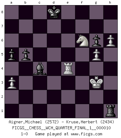 Last move : 1-0 2012 June 8 12:55:39 [Event "FICGS__CHESS__WCH_QUARTER_FINAL_1__000010"] [Site "FICGS"] [Date "2012.01.01"] [Round "7"] [White "Aigner,Michael"] [Black "Kruse,Herbert"] [Result "1-0"] [WhiteElo "2572"] [BlackElo "2434"] 1.d4 Nf6 2.c4 c6 3.Nc3 d5 4.cxd5 cxd5 5.Nf3 Nc6 6.Bf4 a6 7.Rc1 Bf5 8.e3 Rc8 9.Nh4 Bg4 10.f3 Bd7 11.g4 e6 12.Ng2 Na5 13.h4 Nc4 14.Bxc4 dxc4 15.Kf2 Nd5 16.Nxd5 exd5 17.e4 dxe4 18.fxe4 Qb6 19.Ne3 Qxb2+ 20.Rc2 Qb5 21.Nd5 Rc6 22.g5 Qa4 23.h5 b5 24.Rh2 Bg4 25.Qd2 Qa3 26.Rc3 Qa5 27.Qe3 Rg8 28.a3 Qd8 29.Ke1 Qd7 30.Nb4 Rc8 31.Nd5 Rc6 32.Nb4 Rc8 33.Qg3 Be7 34.Rh4 f5 35.Re3 Kd8 36.Nd5 c3 37.Rxc3 Rxc3 38.Qxc3 Qe6 39.Qe3 Re8 40.Kf2 Qc6 41.h6 g6 42.Kg3 Bd6 43.Nf6 Bxf4+ 44.Qxf4 Qc3+ 45.Kg2 Qc2+ 46.Qf2 Qd3 47.Rh1 Re7 48.Rc1 Bf3+ 49.Kh2 fxe4 50.Qa2 Qe2+ 51.Qxe2 Bxe2 52.d5 Bc4 53.d6 Rb7 54.Kg3 a5 55.Kf4 e3 56.Rc3 Rb6 57.Rxe3 Rxd6 58.Nxh7 Rd4+ 59.Kg3 Rd1 60.Nf6 Rh1 61.Re4 1-0 Thibault de Vassal Amazing game! Alvin Alcala Very nice. Is this the way how you play for a win? Herbert Kruse no, but i made some mistakes, black was better in the opening Queen's pawn game Player White won this chess game. Follow this game move after move (download)Fischer Chess play was always razor-sharp, rational and brilliant. One of the best ever. (Dave Regis) In der Schule lernt man nichts. Es ist nur Zeitverschwendung. (Robert James Fischer) Combinaciones deslumbrantes son para la mayoría, mover madera es para los pocos. (Georg Kieninger) Pour se monter efficace, un Cavalier a besoin d'avant-postes ! Les Cavaliers font les meilleurs bloqueurs de pions passés. Gambling is the son of avarice and the father of despair. (French proverb)