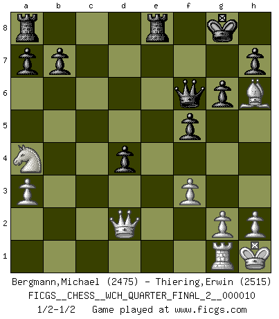 Last move : 1/2-1/2 2012 January 30 17:56:7 [Event "FICGS__CHESS__WCH_QUARTER_FINAL_2__000010"] [Site "FICGS"] [Date "2012.01.01"] [Round "2"] [White "Bergmann,Michael"] [Black "Thiering,Erwin"] [Result "1/2-1/2"] [WhiteElo "2475"] [BlackElo "2515"] 1.e4 e5 2.Nf3 Nf6 3.Nxe5 d6 4.Nf3 Nxe4 5.d4 d5 6.Bd3 Bd6 7.O-O O-O 8.c4 c6 9.Qc2 Na6 10.a3 Bg4 11.Ne5 Bxe5 12.dxe5 Nac5 13.f3 Nxd3 14.Qxd3 Nc5 15.Qd4 Nb3 16.Qxg4 Nxa1 17.Bh6 g6 18.Nc3 Qb6+ 19.Kh1 Qxb2 20.Qf4 f5 21.Na4 Qe2 22.Rxa1 Rfe8 23.cxd5 cxd5 24.Qb4 Qxe5 25.Rg1 Qf6 26.Qd2 d4 1/2-1/2 Petrov : Classical attack, Marshall variation Kingside Castling by player White (move 7) Kingside Castling by player Black (move 7) This chess game ended in a draw. Follow this game move after move (download)There is only one thing Fischer does in Chess without pleasure: to lose ! (Boris Spassky) Fallen sollten polizeilich verboten werden. (Savielly Grigorievitsch Tartakower) El Ajedrez es un mar en el cual un mosquito puede beber y un elefante puede bañarse. (Refrán Hindú) Celui qui prend des risques peut perdre, celui qui n'en prend pas perd toujours. (Xavier Tartacover) There are three kinds of lies: lies, damned lies and statistics. (Mark Twain)