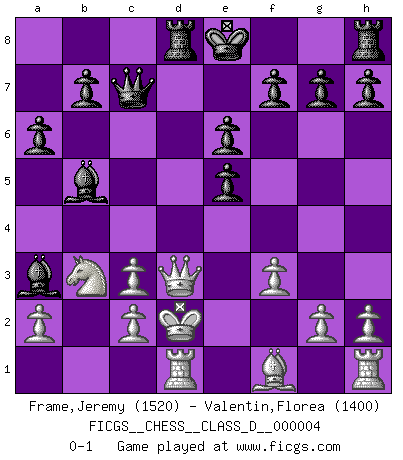 Last move : 0-1 2006 May 25 15:10:36 [Event "FICGS__CHESS__CLASS_D__000004"] [Site "FICGS"] [Date "2006.05.11"] [Round "1"] [White "Frame,Jeremy"] [Black "Valentin,Florea"] [Result "0-1"] [WhiteElo "1520"] [BlackElo "1400"] 1.e4 c5 2.Nc3 Nc6 3.Nf3 e6 4.d4 cxd4 5.Nxd4 Qc7 6.Be3 Nf6 7.Qd2 Bb4 8.O-O-O Nxe4 9.Qd3 Nxc3 10.bxc3 Ne5 11.Qe2 Ba3+ 12.Kd2 a6 13.Bf4 d6 14.Bxe5 dxe5 15.Nb3 Bd7 16.Qd3 Rd8 17.f3 Bb5 0-1 Sicilian : Closed, 2...Nc6 Queenside Castling by player White (move 8) Player Black won this chess game. Follow this game move after move (download)Fischer wanted to give the Russians a taste of their own medicine. (Larry Evans) Konzentriere dich auf materielle Gewinne. Nimm, was dir dein Gegner gibt, ausser es gibt einen guten Grund der dagegenspricht. (Robert James Fischer) Los libros de Ajedrez deben de usarse igual como usamos los anteojos: para mejorar la vista, aunque algunos jugadores los quieren usar como si ellos les otorgaran la vision. (José Raúl Capablanca) La guerre est enfant de la passion, la passion est enfant du narcissisme et le narcissisme est l'enfant. (...) Une autre partie ? (Thibault de Vassal) Gambling is the son of avarice and the father of despair. (French proverb)