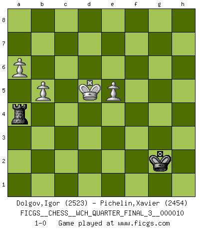 Last move : 1-0 2012 May 31 16:5:3 [Event "FICGS__CHESS__WCH_QUARTER_FINAL_3__000010"] [Site "FICGS"] [Date "2012.01.01"] [Round "3"] [White "Dolgov,Igor"] [Black "Pichelin,Xavier"] [Result "1-0"] [WhiteElo "2523"] [BlackElo "2454"] 1.e4 e5 2.Nf3 Nc6 3.Bb5 a6 4.Ba4 Nf6 5.O-O Be7 6.Re1 b5 7.Bb3 d6 8.c3 O-O 9.h3 Re8 10.d4 Bb7 11.Nbd2 Bf8 12.a4 h6 13.Bc2 exd4 14.cxd4 Nb4 15.Bb1 c5 16.d5 Nd7 17.Ra3 g6 18.Nh2 Bg7 19.Ndf3 h5 20.a5 Qc7 21.g4 Nf6 22.gxh5 Nxh5 23.Ng4 Qd7 24.Ng5 Re7 25.Rf3 Rf8 26.Bd2 Qd8 27.Kh2 Bc8 28.Rg1 Ra7 29.Qc1 Kh8 30.Bc3 f6 31.Ne6 Bxe6 32.dxe6 Nc6 33.Nh6 Ne5 34.Nf7+ R8xf7 35.Bxe5 Rfe7 36.Bc3 Qe8 37.e5 f5 38.exd6 Rxe6 39.Bxg7+ Rxg7 40.Qxc5 Qd8 41.Rd1 Rd7 42.Rfd3 Kh7 43.Ba2 Re2 44.Bd5 Nf6 45.Bc6 Ne4 46.Bxe4 fxe4 47.R3d2 Rxd2 48.Rxd2 Qf6 49.Qd4 Qg5 50.Qc3 Qf5 51.Kg2 Qg5+ 52.Kf1 Qf4 53.Rd5 Qf7 54.Rd4 Qf6 55.Kg2 Qe6 56.Qc6 Kg7 57.Qc3 Kg8 58.Qg3 Kg7 59.Kf1 Qf6 60.Qc3 Kh7 61.Rd2 Qf4 62.Ke1 Qf5 63.Qd4 Qe6 64.Ke2 Qf5 65.Rc2 Qf3+ 66.Ke1 e3 67.fxe3 Qg3+ 68.Ke2 Qh2+ 69.Kd3 Qxd6 70.Qxd6 Rxd6+ 71.Ke4 Kh6 72.Rc7 Kg5 73.Ra7 b4 74.Rb7 Rd1 75.Rxb4 Ra1 76.Rd4 Kh4 77.b4 Kxh3 78.Rd6 g5 79.Rxa6 Ra4 80.Rb6 g4 81.a6 Kg2 82.Kd5 g3 83.b5 Kf2 84.e4 g2 85.Rf6+ Ke3 86.Rg6 Kf3 87.Rxg2 Kxg2 88.e5 1-0 Thibault de Vassal Another excellent game! Great match and congratulations to Igor... Ruy Lopez : Closed Kingside Castling by player White (move 5) Kingside Castling by player Black (move 8) 10 pieces endgame at move 75 : White KRPPPP , Black KRPP WHITE : King + 1 Rook 4 Pawns BLACK : King + 1 Rook 2 Pawns 9 pieces endgame at move 77 : White KRPPP , Black KRPP WHITE : King + 1 Rook 3 Pawns BLACK : King + 1 Rook 2 Pawns 8 pieces endgame at move 79 : White KRPPP , Black KRP WHITE : King + 1 Rook 3 Pawns BLACK : King + 1 Rook 1 Pawn 7 pieces endgame at move 87 : White KRPPP , Black KR WHITE : King + 1 Rook 3 Pawns BLACK : King + 1 Rook 6 pieces endgame at move 87 : White KPPP , Black KR WHITE : King + 3 Pawns BLACK : King + 1 Rook Player White won this chess game. Follow this game move after move (download)Could we look into the head of a Chess player, we should see there a whole world of feelings, images, ideas, emotion and passion. (Alfred Binet) Matt entspricht nicht immer den Tatsachen. (Savielly Grigorievitsch Tartakower) Las piezas de Ajedrez son los bloques del alfabeto que moldean los pensamientos; y esos pensamientos, aunque hagan un diseño visual en el tablero, expresan abstractamente su belleza como un poema. (Marcel Duchamp) Un millionnaire : 'Monsieur Steinitz ! Vous ne participez aux tournois que pour l'argent, alors que moi je n'y viens que pour l'honneur.' Steinitz : 'Chacun joue pour ce qu'il n'a pas'... The only sure thing about luck is that it will change. (Wilson Mizner)