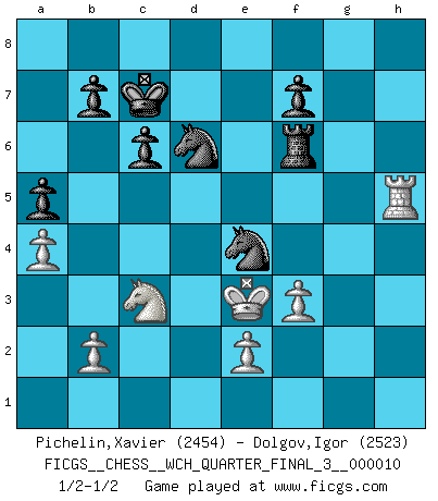 Last move : 1/2-1/2 2012 February 24 21:30:48 [Event "FICGS__CHESS__WCH_QUARTER_FINAL_3__000010"] [Site "FICGS"] [Date "2012.01.01"] [Round "6"] [White "Pichelin,Xavier"] [Black "Dolgov,Igor"] [Result "1/2-1/2"] [WhiteElo "2454"] [BlackElo "2523"] 1.d4 d5 2.c4 c6 3.Nf3 Nf6 4.Nc3 dxc4 5.a4 Bf5 6.Ne5 Nbd7 7.Nxc4 Qc7 8.g3 e5 9.dxe5 Nxe5 10.Bf4 Nfd7 11.Bg2 g5 12.Ne3 gxf4 13.Nxf5 O-O-O 14.Qc2 Nc5 15.O-O fxg3 16.hxg3 a5 17.Rfd1 h5 18.Rxd8+ Qxd8 19.Rd1 Qf6 20.Qd2 Kb8 21.Qf4 Ka7 22.Kf1 h4 23.gxh4 Rh5 24.Bh3 Ng6 25.Qc7 Na6 26.Qc8 Be7 27.Nxe7 Nxe7 28.Qd8 Qxh4 29.Bg2 Nf5 30.Bf3 Qxd8 31.Rxd8 Rh4 32.Be4 Rf4 33.f3 Nc5 34.Kf2 Kb6 35.Rd1 Kc7 36.Rh1 Nd6 37.Ke3 Rf6 38.Rh5 Ncxe4 1/2-1/2 QGD Slav : Krause attack Queenside Castling by player Black (move 13) Kingside Castling by player White (move 15) This chess game ended in a draw. Follow this game move after move (download)Everything is in a state of flux, and this includes the world of Chess. (Mikhail Botvinnik) Die jungen Leute sollen verstehen, dass sie noch etwas von mir lernen können und müssen. (Viktor Kortschnoi) Estaba muy claro de que el punto vulnerable del Gran Maestro Americano (Bobby Fischer) radicaba en las posiciones de doble filo, colgantes, irracionales, donde el siempre falló en encontrar un triunfo aún en una posición de clara victoria. (Efim Geller) Le joueur d'Echecs qui veut atteindre le top est obligé de développer son propre credo créatif. Alexeï Stepanovicth Souétine. Il est facile d'écrire des livres ! Ce qui est difficile, c'est de jouer ! (Alexeï Stepanovicth Souétine) Programming can only do so much before it becomes too much. (Don Groves)