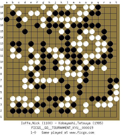 Last move : 1-0 2007 May 5 17:34:43 [Event "FICGS__GO__TOURNAMENT_KYU__000019"] [Site "FICGS"] [Date "2007.01.11"] [Round "1"] [Black "Ioffe,Nick"] [White "Kobayashi,Tetsuya"] [Result "1-0"] [Rating 1 "1100"] [Rating 2 "1985"] 1.q16 d4 2.q4 d17 3.q10 o3 4.m3 r3 5.r4 q3 6.p4 o2 7.n5 r12 8.r11 q12 9.r14 o11 10.o9 p14 11.o16 c11 12.f3 d6 13.j4 s4 14.s5 s3 15.d15 r9 16.s11 p9 17.p10 o10 18.s12 q11 19.r10 n9 20.o8 n8 21.o7 n7 22.n6 n14 23.m16 k17 24.c17 c18 25.c16 e18 26.f16 g17 27.e11 d9 28.c3 d3 29.d2 c4 30.b2 b3 31.c2 j7 32.h15 n17 33.o17 m17 34.n16 l16 35.l15 k15 36.l14 k11 37.k14 h3 38.h4 k3 39.k4 m2 40.l2 l3 41.k2 m4 42.j3 l4 43.n10 m11 44.m10 l10 45.m9 l8 46.n11 n12 47.o12 p11 48.m12 n13 49.l11 l12 50.m11 m8 51.k12 m13 52.l13 l9 53.l12 r13 54.r15 q14 55.p13 o13 56.p12 o15 57.n15 p15 58.s13 q13 59.l6 g7 60.c13 j11 61.e7 d7 62.f9 f8 63.e8 e9 64.f6 f10 65.g9 f7 66.g6 h7 67.g10 e10 68.g11 e6 69.h17 h18 70.g18 f18 71.j18 j17 72.h16 g19 73.b18 b19 74.a17 t5 75.s6 t6 76.t7 t4 77.s7 b12 78.b13 h12 79.g13 f11 80.g12 e12 81.e13 o18 82.p18 n18 83.p16 p19 84.q19 o19 85.q18 f2 86.h2 e3 87.e2 f4 88.g3 b4 89.l18 l17 90.k18 m19 91.j16 l19 92.k16 j19 93.c12 b11 94.j9 k9 95.j10 k10 96.h11 j12 97.l5 g16 98.k7 1-0 Here are the names of the openings (joseki) played in the four corners : Corner q4 : q4 o3 Hoshi (Hwajeom, Seongjeom, Xingwei`) 4-4 Point. The star or hoshi (4-4) point, emphasizing influence at the potential expense of territory. Ikken Kakari (Hankan Keolch'im, Yi Gua`jiao~, 1-Space Low Approach). White 2 is the standard approach move to the 4-4. Corner q16 : q16 r12 Hoshi (Hwajeom, Seongjeom, Xingwei`) 4-4 Point. The star or hoshi (4-4) point, emphasizing influence at the potential expense of territory. Corner d4 : d4 f3 Hoshi (Hwajeom, Seongjeom, Xingwei`) 4-4 Point. The star or hoshi (4-4) point, emphasizing influence at the potential expense of territory. Ikken Kakari (Hankan Keolch'im, Yi Gua`jiao~, 1-Space Low Approach). Black 2 is the standard approach move to the 4-4. Player Black won this Go (weiqi, baduk) game. Follow this game move after move (download)Error is one of the sources of transformation. (Pierre Audouard) There's no money in correspondence chess. (John Knudsen)
