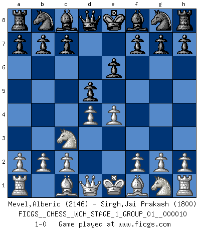 Last move : 1-0 2012 February 3 18:47:19 [Event "FICGS__CHESS__WCH_STAGE_1_GROUP_01__000010"] [Site "FICGS"] [Date "2012.01.01"] [Round "1"] [White "Mevel,Alberic"] [Black "Singh,Jai Prakash"] [Result "1-0"] [WhiteElo "2146"] [BlackElo "1800"] 1.e4 e6 2.d4 d5 3.Nc3 1-0 This chess game has been lost on time (started : 2012.01.01 23:8:13) French : Paulsen variation Player White won this chess game. Follow this game move after move (download)By this measure (on the gap between Fischer & his contemporaries), I consider him the greatest world champion. (Garry Kasparov) Spielt Blackmar-Diemer-Gambit, und das Matt kommt von selbst! (Emil Joseph Diemer) No solamente yo pronostico su triunfo sobre Botvinnik, sino que me adelanto y digo que probablemente Fischer es el jugador de Ajedrez mas grande que haya existido. (John Collins) Toute estimation doit être constamment réévaluée. (Jacob Estrin) Yoga is 99% practice and 1% knowledge. (Sri Krishna Pattabhi Jois)
