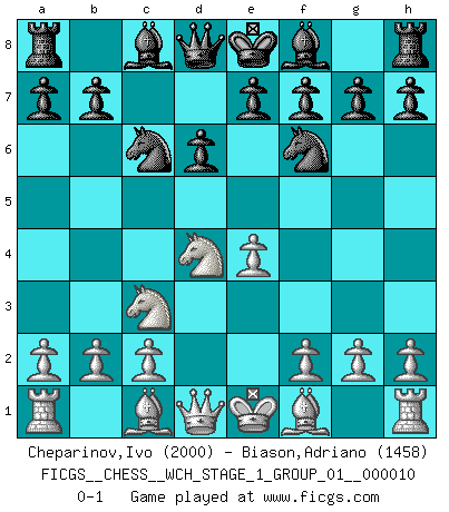 Last move : 0-1 2012 February 7 19:9:59 [Event "FICGS__CHESS__WCH_STAGE_1_GROUP_01__000010"] [Site "FICGS"] [Date "2012.01.01"] [Round "1"] [White "Cheparinov,Ivo"] [Black "Biason,Adriano"] [Result "0-1"] [WhiteElo "2000"] [BlackElo "1458"] 1.e4 c5 2.Nf3 d6 3.d4 cxd4 4.Nxd4 Nf6 5.Nc3 Nc6 0-1 This chess game has been lost on time (started : 2012.01.01 23:8:13) Sicilian Player Black won this chess game. Follow this game move after move (download)Fischer is under obligation to nobody. (Joseph Platz) Je älter ich werde, um so mehr schätze ich die Bauern. (Paul Keres) Una de estas pequeñas movidas modestas pudieran ser mas molestas a tu oponente que la amenaza mas grande. (Siegbert Tarrasch) Nous vivons dans un monde échiquéen : chaque jour qui passe est un défi à relever. (Philosophe Sasha) Tomorrow's what you make of it. (Horatio Caine, C.S.I. Miami)