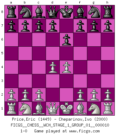 Last move : 1-0 2012 February 5 19:5:24 [Event "FICGS__CHESS__WCH_STAGE_1_GROUP_01__000010"] [Site "FICGS"] [Date "2012.01.01"] [Round "1"] [White "Price,Eric"] [Black "Cheparinov,Ivo"] [Result "1-0"] [WhiteElo "1449"] [BlackElo "2000"] 1.e4 e6 2.d4 1-0 This chess game has been lost on time (started : 2012.01.01 23:8:13) French defense Player White won this chess game. Follow this game move after move (download)Chess is the art of analysis. (Mikhail Botvinnik) Wenn ein Kopf und ein Buch zusammenstoßen und es klingt hohl, ist es denn allemal im Buche? (Georg Christoph Lichtenberg) Los errores estan ahí, esperando a que se cometan. (Savielly Tartakower) Toutes les manuvres exécutées sur une colonne ouverte ont pour but ultime l'intrusion définitive sur la septième ou la huitième rangée, en plein cur de la position ennemie. (Aaron Nimzovitch) It's unlucky to be superstitious. (Dave Enteles)