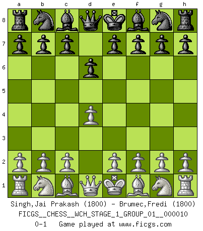Last move : 0-1 2012 February 2 18:45:45 [Event "FICGS__CHESS__WCH_STAGE_1_GROUP_01__000010"] [Site "FICGS"] [Date "2012.01.01"] [Round "1"] [White "Singh,Jai Prakash"] [Black "Brumec,Fredi"] [Result "0-1"] [WhiteElo "1800"] [BlackElo "1800"] 1.d4 d6 0-1 This chess game has been lost on time (started : 2012.01.01 23:8:13) Queen's Pawn Player Black won this chess game. Follow this game move after move (download)If Chess is a science, it's a most inexact one. If Chess is an art, it is too exacting to be seen as one. If Chess is a sport, it's too esoteric. If Chess is a game, it's too demanding to be just a game. If Chess is a mistress, she's a demanding one. If Chess is a passion, it's a rewarding one. If Chess is life, it's a sad one. (Unknown) Später, ... hatte ich zunehmend Erfolg in entscheidenden Partien. Vielleicht weil ich eine einfache Wahrheit erkannte: nicht nur ich hatte Angst, auch mein Gegner. (Mikhail Nekhemyevich Tal) El Ajedrez es como la guerra en un tablero. (Bobby Fischer) Avant la finale, les dieux ont créé le milieu de partie. (Tarrasch) Nowadays, anyone who cannot speak English and is incapable of using the Internet is regarded as backward. (Al-Waleed bin Talal)