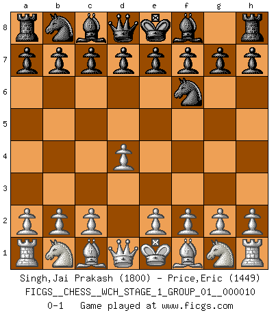 Last move : 0-1 2012 February 2 18:45:45 [Event "FICGS__CHESS__WCH_STAGE_1_GROUP_01__000010"] [Site "FICGS"] [Date "2012.01.01"] [Round "1"] [White "Singh,Jai Prakash"] [Black "Price,Eric"] [Result "0-1"] [WhiteElo "1800"] [BlackElo "1449"] 1.d4 Nf6 0-1 This chess game has been lost on time (started : 2012.01.01 23:8:13) Queen's pawn game Player Black won this chess game. Follow this game move after move (download)One doesn't have to play well, it's enough to play better than your opponent. (Siegbert Tarrasch) Bis zum Jahr 1971 verlief in meiner Schachkariere alles glatt. Dieses dramatische Match [Fischer-Taimanov 6:0] machte mein Leben zur Hölle. (Mark Taimanov) Observen a Garry Kasparov. Después de una derrota, invariablemente el gana la próxima partida. Prácticamente hace pedazos a su siguiente oponente. Eso es algo que tenemos que aprender a lograr. (Maurice Ashley) Ne tendez aucun piège pour le plaisir ! Ne jouez rien dans l'espoir que l'adversaire réagisse de façon stupide ! Prenez toujours pour acquis que l'adversaire va trouver le meilleur coup ! Ne jouez jamais de coup dans l'espoir que l'adversaire ne voie pas la menace ! Chacun de vos coups doit améliorer la position d'une façon ou d'une autre. I've never seen so many men wasted so badly. (Blondie in The Good, The Bad and The Ugly)