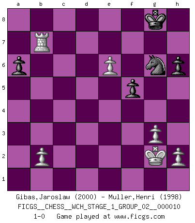 Last move : 1-0 2012 March 19 9:26:9 [Event "FICGS__CHESS__WCH_STAGE_1_GROUP_02__000010"] [Site "FICGS"] [Date "2012.01.01"] [Round "1"] [White "Gibas,Jaroslaw"] [Black "Muller,Henri"] [Result "1-0"] [WhiteElo "2000"] [BlackElo "1998"] 1.d4 Nf6 2.c4 e6 3.Nc3 d5 4.cxd5 exd5 5.Bg5 Be7 6.e3 c6 7.Qc2 Nbd7 8.Bd3 O-O 9.Nge2 Re8 10.O-O Nf8 11.f3 Ng6 12.e4 dxe4 13.fxe4 Be6 14.Bxf6 Bxf6 15.e5 Bg5 16.Rad1 Qb6 17.Kh1 Rad8 18.Na4 Qb4 19.Nc5 Bxa2 20.Nc3 Be6 21.Nxe6 Rxe6 22.Ne4 Bh6 23.Bc4 Re7 24.g3 Nh8 25.Rf3 a6 26.Kg2 Qb6 27.e6 f6 28.d5 cxd5 29.Bxd5 Be3 30.Bb3 Rxd1 31.Qxd1 Ng6 32.Nc3 Bc5 33.Nd5 Qa5 34.Nxe7+ Bxe7 35.Rc3 h6 36.Bc2 Nf8 37.Rc8 Qe5 38.Qd3 f5 39.Qxf5 Qxf5 40.Bxf5 g6 41.Re8 gxf5 42.Rxe7 Ng6 43.Rxb7 1-0 Queen's pawn game Kingside Castling by player Black (move 8) Kingside Castling by player White (move 10) Player White won this chess game. Follow this game move after move (download)The combination player thinks forward; he starts from the given position, and tries the forceful moves in his mind. (Emanuel Lasker) Mit sehr nachdenklichem Gesicht schreitet Bobby durch den Turniersaal. Was ist passiert?, fragt Lombardy. Ich stehe schlecht, antwortet Fischer. Lombardy: Dann biete doch einfach Remis an. Fischer: So schlecht stehe ich nun auch wieder nicht! (Robert James Fischer) Tu sabes, camarada Pachman, no disfruto el ser un Ministro, preferería jugar al Ajedrez como tu. (Che Guevara) La vie est comme un jeu d'échecs : nous esquissons un plan, mais celui-ci est tributaire de ce que daignent faire l'adversaire aux échecs et le destin dans la vie. (Arthur Schopenhauer) The intuitive mind is a sacred gift; the rational mind is a faithful servant. We have created a society that honors the servant but has forgotten the gift. (Albert Einstein)