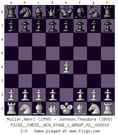 Last move : 1-0 2012 February 1 18:42:13 [Event "FICGS__CHESS__WCH_STAGE_1_GROUP_02__000010"] [Site "FICGS"] [Date "2012.01.01"] [Round "1"] [White "Muller,Henri"] [Black "Johnson,Theodore"] [Result "1-0"] [WhiteElo "1998"] [BlackElo "1800"] 1.e4 1-0 This chess game has been lost on time (started : 2012.01.01 23:11:9) King's pawn Opening Player White won this chess game. Follow this game move after move (download)Chess is played with the mind and not with the hands ! (Renaud and Kahn) Ich verstehe Aljechins Kombinationen ganz gut; aber woher er diese Angriffschancen bekommt und wie er die Eröffnung behandelt das ist für mich ein Buch mit sieben Siegeln. (Rudolf Spielmann) El Ajedrez es un juego terrible. Si no dominas el centro, tu oponente tiene una posición mas libre. Si tu tienes el centro, entonces realmente tienes algo de que preocuparte. (Siegbert Tarrasch) Demandez au pauvre Cg1 ce qu'il en pense. Eduard Gufeld à propos de la variante Saemisch de l'Est-Indienne. Life is like a ten-speed bicycle: most of us have gears we never use. (Charles M. Schulz)