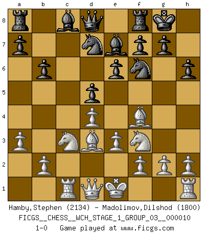 Last move : 1-0 2012 February 23 7:52:58 [Event "FICGS__CHESS__WCH_STAGE_1_GROUP_03__000010"] [Site "FICGS"] [Date "2012.01.01"] [Round "1"] [White "Hamby,Stephen"] [Black "Madolimov,Dilshod"] [Result "1-0"] [WhiteElo "2134"] [BlackElo "1800"] 1.d4 d5 2.c4 e6 3.Nf3 Nf6 4.Nc3 Be7 5.Bg5 O-O 6.e3 Nbd7 7.Rc1 c6 8.a3 b6 9.cxd5 cxd5 10.Bd3 h6 11.Bf4 1-0 This chess game has been lost on time (started : 2012.01.01 23:13:6) Queen's gambit declined Kingside Castling by player Black (move 5) Player White won this chess game. Follow this game move after move (download)As one by one I mowed them down, my superiority soon became apparent. (Jose Capablanca) Frage des Reporters: -Worin besteht das Ziel von Gambiteröffnungen? Antwort: -Auf Kosten der Partie einen Ruf als Angriffspieler zu erwerben.- (Siegbert Tarrasch) Después de la respuesta de las negras a 1.e4 con 1..e5, se quedan siempre tratando de entrar dentro del juego. (Howard Staunton) Votre prénom est 'Tactique', votre deuxième prénom est 'Tactique' et votre nom est 'Tactique'. (Ken Smith) Art disturbs, science reassures. (Georges Braque, Le Jour et la Nuit)