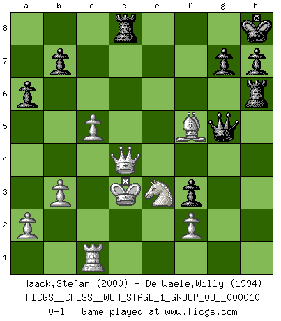 Last move : 0-1 2012 March 21 20:42:49 [Event "FICGS__CHESS__WCH_STAGE_1_GROUP_03__000010"] [Site "FICGS"] [Date "2012.01.01"] [Round "1"] [White "Haack,Stefan"] [Black "De Waele,Willy"] [Result "0-1"] [WhiteElo "2000"] [BlackElo "1994"] 1.e4 c5 2.Nf3 d6 3.d4 cxd4 4.Nxd4 Nf6 5.Nc3 a6 6.Be3 e5 7.Nf3 Be7 8.Bc4 O-O 9.O-O Nc6 10.Qe2 Na5 11.Bd3 Be6 12.Na4 Rb8 13.Bb6 Qe8 14.b3 Nc6 15.c3 Nh5 16.Be3 Nf4 17.Bxf4 exf4 18.Nb6 Ne5 19.Nxe5 dxe5 20.Rfd1 Bd8 21.Nd5 Rc8 22.Rac1 Rc6 23.Qf3 Bc8 24.c4 Rh6 25.Be2 Rh4 26.Qc3 f5 27.exf5 Bxf5 28.c5 Rh6 29.Qc4 Kh8 30.Bf3 e4 31.Re1 Bg5 32.Bxe4 Qh5 33.Bxf5 Qxh2+ 34.Kf1 Qh1+ 35.Ke2 Qxg2 36.Qd4 f3+ 37.Kd3 Bxc1 38.Rxc1 Qg5 39.Ne3 Rd8 0-1 Sicilian : Najdorf, Byrne (English) attack Kingside Castling by player Black (move 8) Kingside Castling by player White (move 9) Player Black won this chess game. Follow this game move after move (download)I look one move ahead... the best ! (Siegbert Tarrasch) Ich rechne überhaupt nicht voraus. Ich gewinne auch so. (Robert James Fischer) Las ideas audaces son como las piezas del Ajedrez que avanzan hacia adelante. Ellas pueden ser vencidas, pero también pueden iniciar una partida victoriosa. (Goethe) Roi des jeux et jeu des rois, les échecs portent en eux un sentiment d'infini. Ils donnent à celui qui s'est efforcé d'en approfondir les arcanes l'impression de n'être pas à la mesure de l'homme; en fait, ils constituent un résumé de l'univers, un microcosme, et figurent cette grande échelle qui, dans les plans de la lumière descend jusqu'à la matière, qui des abîmes insondables remonte jusqu'en l'infini de Dieu. (Pyrame) However beautiful the strategy, you should occasionally look at the results. (Winston Churchill)