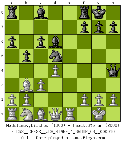 Last move : 0-1 2012 February 23 19:54:29 [Event "FICGS__CHESS__WCH_STAGE_1_GROUP_03__000010"] [Site "FICGS"] [Date "2012.01.01"] [Round "1"] [White "Madolimov,Dilshod"] [Black "Haack,Stefan"] [Result "0-1"] [WhiteElo "1800"] [BlackElo "2000"] 1.e4 e5 2.Nf3 Nc6 3.Bb5 a6 4.Ba4 Nf6 5.O-O Be7 6.Re1 b5 7.Bb3 O-O 8.c3 d5 9.exd5 Nxd5 10.Nxe5 Nxe5 11.Rxe5 c6 12.d4 Bd6 13.Re1 Qh4 0-1 This chess game has been lost on time (started : 2012.01.01 23:13:6) Ruy Lopez : Closed, 7...O-O Kingside Castling by player White (move 5) Kingside Castling by player Black (move 7) Player Black won this chess game. Follow this game move after move (download)Before the endgame, the Gods have placed the middle game. (Siegbert Tarrasch) Die jungen Leute sollen verstehen, dass sie noch etwas von mir lernen können und müssen. (Viktor Kortschnoi) Morphy probablemente fue el genio más grande de todos. (Bobby Fischer) Le jeu d'échecs est comme rejeté hors du temps. (Antoine de Saint-Exupéry) Opportunities multiply as they are seized. (Sun Tzu)