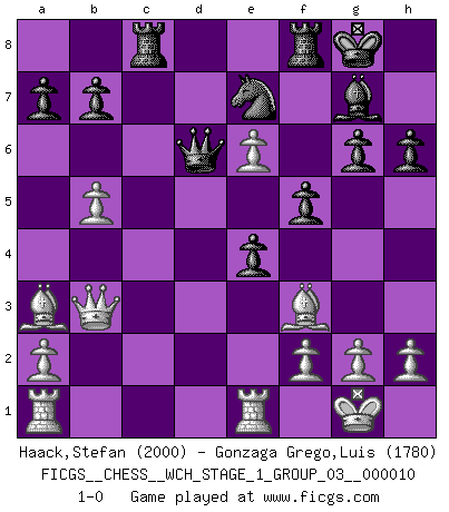 Last move : 1-0 2012 March 30 10:50:42 [Event "FICGS__CHESS__WCH_STAGE_1_GROUP_03__000010"] [Site "FICGS"] [Date "2012.01.01"] [Round "1"] [White "Haack,Stefan"] [Black "Gonzaga Grego,Luis"] [Result "1-0"] [WhiteElo "2000"] [BlackElo "1780"] 1.d4 Nf6 2.c4 g6 3.Nc3 Bg7 4.e4 d6 5.Nf3 O-O 6.Be2 e5 7.O-O Nc6 8.d5 Ne7 9.b4 Nh5 10.Re1 f5 11.Ng5 Nf6 12.Bf3 c6 13.b5 cxd5 14.cxd5 h6 15.Ne6 Bxe6 16.dxe6 Rc8 17.Qb3 d5 18.Nxd5 Nfxd5 19.exd5 e4 20.d6 Qxd6 21.Ba3 1-0 This chess game has been lost on time (started : 2012.01.01 23:13:6) King's Indian : Orthodox, Aronin-Taimanov variation (Yugoslav attack / Mar del Plata variation) Kingside Castling by player Black (move 5) Kingside Castling by player White (move 7) Player White won this chess game. Follow this game move after move (download)All Chess players should have a hobby. (Savielly Tartakower) Wenn sie aufgeben, dann danke ich Ihnen für das Spiel (Eventualzug beim Fernschach). (Anonymous) El Ajedrez es tan interesante por sí solo, que no es necesario un interés monetario para persuadir a una persona a que lo practique; por lo tanto, nunca se juega por dinero. (Benjamin Franklin) La conception d'un plan est le processus par lequel un joueur exploite les avantages de sa position tout en s'efforçant d'en réduire au minimum les inconvénients. Afin de garantir le succès, un plan doit toujours se fonder sur un diagnostic objectif des particularités d'une position. La conception d'un plan est d'autant plus difficile que la position est équilibrée, et grandement facilitée lorsqu'il n'existe qu'un seul plan susceptible de répondre aux exigences de la position. (Harry Golombek) Hardware: the parts of a computer that can be kicked. (Jeff Persis)