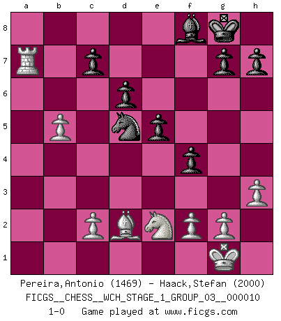 Last move : 1-0 2012 April 12 23:35:1 [Event "FICGS__CHESS__WCH_STAGE_1_GROUP_03__000010"] [Site "FICGS"] [Date "2012.01.01"] [Round "1"] [White "Pereira,Antonio"] [Black "Haack,Stefan"] [Result "1-0"] [WhiteElo "1469"] [BlackElo "2000"] 1.e4 e5 2.Nc3 Nc6 3.Nf3 Nf6 4.Be2 Be7 5.O-O O-O 6.d4 d6 7.d5 Nb8 8.Be3 Nbd7 9.h3 Kh8 10.Qd3 b6 11.b4 Bb7 12.a3 Qc8 13.Nd2 a5 14.Nc4 Nxe4 15.Nxe4 f5 16.Nc3 f4 17.Bd2 Ba6 18.Qf3 axb4 19.axb4 Nf6 20.Qd3 Qd7 21.Nxb6 Bxd3 22.Nxd7 Bxe2 23.Nxf8 Rxa1 24.Rxa1 Bxf8 25.Nxe2 Nxd5 26.b5 Kg8 27.Ra7 1-0 This chess game has been lost on time (started : 2012.01.01 23:13:6) Vienna game, Max Lange defense Kingside Castling by player White (move 5) Kingside Castling by player Black (move 5) Player White won this chess game. Follow this game move after move (download)Chess is really ninety nine percent calculation. (Soltis) Jeder leidlich begabte Spieler, er braucht keineswegs hervorragend veranlagt zu sein, kann es zum Meister bringen. Aber das ist ja auch gar nicht nötig! Der richtige Standpunkt ist es, zu seinem Vergnügen zu spielen, und man glaube ja nicht, dass der Genuss proportional dem Können sei. (Siegbert Tarrasch) Coloca el contenido de las piezas del Ajedrez en un sombrero, agitalo vigorosamente, arrojalas en un tablero desde una altura de 30 centimetros y así obtendras el estilo de Steinitz. (H. E. Bird) Vous m'avez demandé de vous exposer quel est le fondement de la prière. Je ne fais que préparer les pièces du jeu sur la table... Nous sera-t-il permis d'en adopter les règles et si nous les appliquons scrupuleusement nous ne tarderons pas à faire mat le Roi divin ! Il ne pourra échapper à nos mains. (Sainte Thérèse d'Avila, Chemin de perfection) Think like a man of action, act like a man of thought. (Henri Louis Bergson)