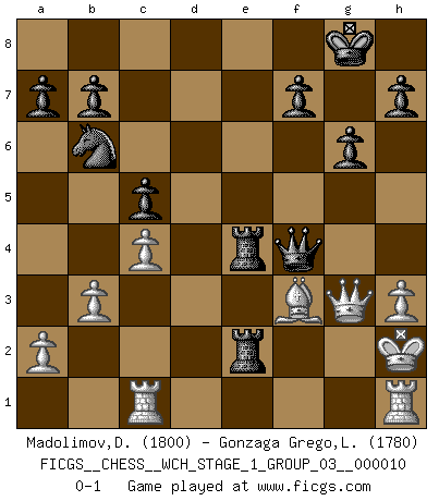 Last move : 0-1 2012 January 14 1:42:42 [Event "FICGS__CHESS__WCH_STAGE_1_GROUP_03__000010"] [Site "FICGS"] [Date "2012.01.01"] [Round "1"] [White "Madolimov,Dilshod"] [Black "Gonzaga Grego,Luis"] [Result "0-1"] [WhiteElo "1800"] [BlackElo "1780"] 1.e4 Nf6 2.e5 Nd5 3.c4 Nb6 4.d4 d6 5.f4 g6 6.Nc3 Bg7 7.Nf3 dxe5 8.fxe5 c5 9.d5 Bg4 10.Bf4 O-O 11.Rc1 N8d7 12.Qe2 Qb8 13.h3 Bxf3 14.gxf3 Bxe5 15.Bxe5 Qxe5 16.b3 Qf4 17.Rc2 Rae8 18.Kf2 e6 19.dxe6 Rxe6 20.Qd2 Qh4+ 21.Kg2 Rfe8 22.Rc1 Re3 23.Ne4 R8xe4 24.Qf2 Qg5+ 25.Kh2 Ne5 26.Bg2 Qf4+ 27.Qg3 Nxf3+ 28.Bxf3 Re2+ 0-1 Alekhine's defense Kingside Castling by player Black (move 10) Player Black won this chess game. Follow this game move after move (download)The tactician knows what to do when there is something to do; whereas the strategian knows what to do when there is nothing to do. (Gerald Abrahams) Der Bart als Geschlechtszeichen mitten im Gesicht ist obszön. Daher gefällt er den Weibern. [Zugegeben, kein Schachzitat, aber unglaublich originell] (Arthur Schopenhauer) Me dio la sensación de como si yo estuviera jugando en contra del mismo Ajedrez. - al estar jugando en contra de Robert Fischer (Walter Shipman) Lorsque vous vous retrouvez devant une position atroce, ne tendez pas un ultime piège dérisoire avec l'intention d'abandonner si l'adversaire le déjoue ! Faites-vous plutôt un devoir de résister comme si votre vie en dépendait. Jouez le coup qui vous déplairait au centuple si vous étiez dans la peau de votre tortionnaire ! Everything in life is luck. (Donald Trump)