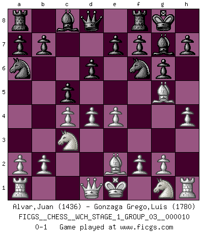 Last move : 0-1 2012 February 8 19:14:12 [Event "FICGS__CHESS__WCH_STAGE_1_GROUP_03__000010"] [Site "FICGS"] [Date "2012.01.01"] [Round "1"] [White "Alvar,Juan"] [Black "Gonzaga Grego,Luis"] [Result "0-1"] [WhiteElo "1436"] [BlackElo "1780"] 1.c4 Nf6 2.d4 g6 3.Nc3 Bg7 4.e4 d6 5.Be2 O-O 6.Bg5 Na6 7.h4 c5 0-1 This chess game has been lost on time (started : 2012.01.01 23:13:6) English, 1...Nf6 (Anglo-Indian defense) Kingside Castling by player Black (move 5) Player Black won this chess game. Follow this game move after move (download)Chess is like life. (Boris Spassky) Schach ist ein Teil der Kultur, und wenn es mit der Kultur abwärts geht, geht es auch mit dem Schach abwärts. (Mikhail Moiseyevich Botvinik) La vida es como el Ajedrez, con lucha, competición y eventos buenos y malos. (Benjamin Franklin) Les échecs, c'est l'imagination. (David Bronstein) Computers are like Old Testament gods; lots of rules and no mercy. (Joseph Campbell)