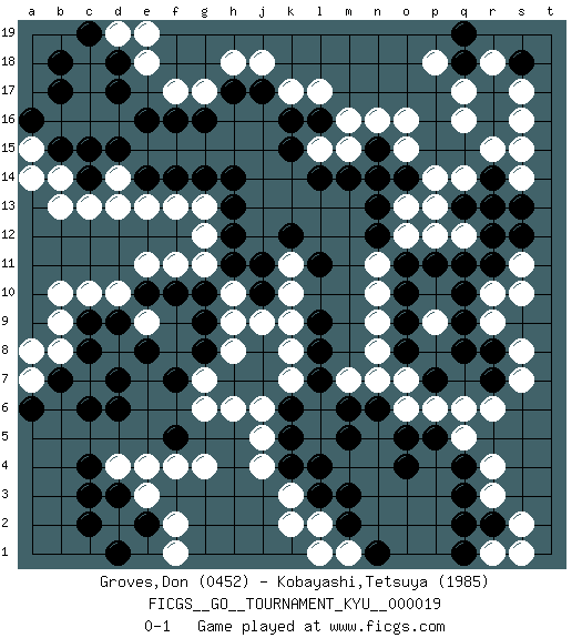 Last move : 0-1 2007 May 12 3:8:28 [Event "FICGS__GO__TOURNAMENT_KYU__000019"] [Site "FICGS"] [Date "2007.01.11"] [Round "1"] [Black "Groves,Don"] [White "Kobayashi,Tetsuya"] [Result "0-1"] [Rating 1 "0452"] [Rating 2 "1985"] 1.q3 q16 2.c4 q5 3.o4 e3 4.d6 k3 5.d17 r3 6.q4 r4 7.m3 g4 8.c15 k17 9.h17 c10 10.c8 c13 11.r14 o16 12.q11 r15 13.r8 r6 14.r2 s2 15.q2 o6 16.c2 q14 17.r13 r10 18.q10 r9 19.q9 s8 20.q8 s7 21.r11 e13 22.q13 p14 23.l11 f17 24.f16 g17 25.g16 h18 26.j17 j18 27.k16 l17 28.l16 m16 29.l14 g13 30.h14 o12 31.o11 n11 32.o10 n10 33.n12 n9 34.l9 o13 35.n13 m7 36.m5 s14 37.s13 s15 38.e16 p12 39.p11 q12 40.r12 s11 41.s12 s10 42.o9 n8 43.o8 o7 44.p7 p6 45.o14 p13 46.h13 d2 47.d3 d4 48.c3 e4 49.e2 f2 50.d1 g12 51.h12 g11 52.d9 d10 53.e10 e11 54.f10 f11 55.g10 g6 56.f7 b8 57.b7 b9 58.k6 l2 59.m2 j4 60.l3 k2 61.l4 h10 62.h11 c7 63.c6 d8 64.d7 e9 65.e8 b14 66.b15 a15 67.a16 a14 68.b17 j6 69.j7 h6 70.h7 g7 71.g8 k7 72.l7 k8 73.j8 j9 74.l8 h8 75.j10 h9 76.g9 m15 77.m14 r1 78.q1 s1 79.c14 b13 80.n15 n16 81.r7 p9 82.n6 n7 83.f5 f4 84.k4 j5 85.k5 f1 86.f14 f13 87.g14 e18 88.d18 d19 89.c19 e19 90.b18 d14 91.d15 k10 92.j11 k9 93.m6 k11 94.k12 m1 95.n1 l1 96.e14 d13 97.p5 q6 98.o5 o15 99.n14 l15 100.k15 a7 101.a6 a8 102.c9 b10 103.r17 q17 104.q18 p18 105.q19 s17 106.r16 r18 107.s18 s16 0-1 Here are the names of the openings (joseki) played in the four corners : Corner q4 : q3 q5 Komoku (Somok, Xiao~mu`) 3-4 Point. The komoku (3-4) point is the traditional corner enclosure move.. Ikken Takagakari (Hankan Nop'dakeolch'im, Yi Gaogua`jiao~, 1-Space High Approach). The 5-4 approach move has become more popular in modern times, as modern Go emphasizes speed and influence. Corner d4 : c4 e3 Komoku (Somok, Xiao~mu`) 3-4 Point. The komoku (3-4) point is the traditional corner enclosure move.. Ikken Kakari (Hankan Keolch'im, Yi Gua`jiao~, 1-Space Low Pincer). The small knight move is the basic approach move to the 3-4 point stone. It has been continually used for over four centuries. There are limitless variations, with new moves constantly being discovered. White 2 opens the door to a treaure store of joseki. Corner q16 : q16 r14 Hoshi (Hwajeom, Seongjeom, Xingwei`) 4-4 Point. The star or hoshi (4-4) point, emphasizing influence at the potential expense of territory. Ikken Kakari (Hankan Keolch'im, Yi Gua`jiao~, 1-Space Low Approach). Black 2 is the standard approach move to the 4-4. Player White won this Go (weiqi, baduk) game. Follow this game move after move (download)Balance is not what players strike for, and if it does arise, it is in spite of them. (Pierre Audouard) Optimism is a variety of information deficit. Sometimes especially true for correspondence chess games. (Michael Aigner)