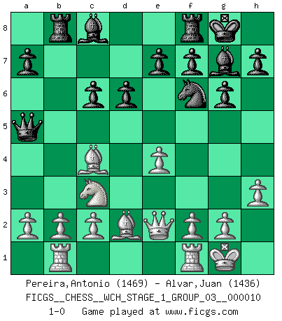 Last move : 1-0 2012 March 3 20:8:2 [Event "FICGS__CHESS__WCH_STAGE_1_GROUP_03__000010"] [Site "FICGS"] [Date "2012.01.01"] [Round "1"] [White "Pereira,Antonio"] [Black "Alvar,Juan"] [Result "1-0"] [WhiteElo "1469"] [BlackElo "1436"] 1.e4 c5 2.Nc3 g6 3.Nf3 Bg7 4.Bc4 d6 5.d4 cxd4 6.Nxd4 Nc6 7.Nxc6 bxc6 8.O-O Nf6 9.h3 O-O 10.Qe2 Rb8 11.Rb1 Qa5 12.Bd2 1-0 This chess game has been lost on time (started : 2012.01.01 23:13:6) Sicilian : Closed Kingside Castling by player White (move 8) Kingside Castling by player Black (move 9) Player White won this chess game. Follow this game move after move (download)Chess is war over the board. The object is to crush the opponents mind. (Bobby Fischer) Das Blackmar-Diemer-Gambit verändert den ganzen Menschen! (Emil Joseph Diemer) Yo siempre he tenido un ligero sentimiento de lástima por una persona que no tiene conocimiento del Ajedrez. (Siegbert Tarrasch) En blitz, le Cavalier l'emporte sur le Fou. (Vlastimil Hort) A good teacher is like a candle - it consumes itself to light the way for others. (Author unknown)
