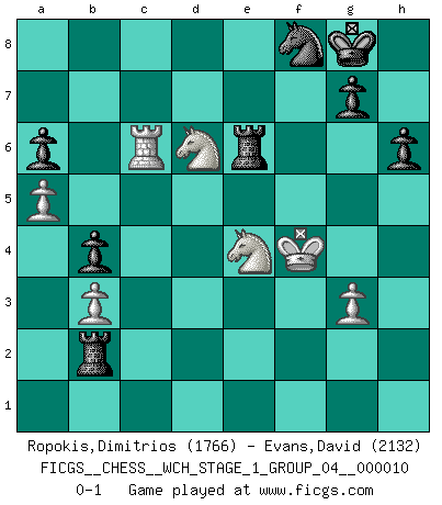 Last move : 0-1 2012 March 15 20:44:50 [Event "FICGS__CHESS__WCH_STAGE_1_GROUP_04__000010"] [Site "FICGS"] [Date "2012.01.01"] [Round "1"] [White "Ropokis,Dimitrios"] [Black "Evans,David"] [Result "0-1"] [WhiteElo "1766"] [BlackElo "2132"] 1.d4 Nf6 2.c4 e6 3.Nf3 d5 4.g3 dxc4 5.Qa4+ Nbd7 6.Qxc4 a6 7.Bg2 b5 8.Qc6 Ra7 9.Bd2 Bb7 10.Qc1 c5 11.a4 b4 12.a5 cxd4 13.O-O e5 14.Bg5 Be7 15.Nbd2 Bd5 16.Bxf6 Bxf6 17.Ne1 Bxg2 18.Kxg2 Rc7 19.Qd1 Qa8+ 20.f3 O-O 21.Nd3 Rfc8 22.b3 Be7 23.Nc4 e4 24.Nf2 f5 25.Qxd4 Bf6 26.Qd6 Bxa1 27.Rxa1 Qc6 28.Qxc6 Rxc6 29.fxe4 fxe4 30.Nxe4 Re6 31.Ncd6 Rc2 32.Kf3 Rb2 33.Kf4 Rxe2 34.Rc1 h6 35.Rc4 Rxh2 36.Rc7 Nf8 37.Rc6 Rb2 0-1 This chess game has been lost on time (started : 2012.01.01 23:14:7) Queen's pawn game Kingside Castling by player White (move 13) Kingside Castling by player Black (move 20) Player Black won this chess game. Follow this game move after move (download)Chess is life. (Bobby Fischer) Wenn Schach ein enormer Dschungel ist, der seine Myriaden von Geheimnissen nicht preisgeben will, dann sind Computer die Kettensägen einer gewaltigen ökologisch unsensiblen Nutzholzfirma. (Nigel Short) Yo nunca en mi vida he jugado la Defensa Francesa, que viene siendo la más aburrida de todas las Aperturas. (Wilhelm Steinitz) Shah mat. Le roi est mort. Cri de fierté d'un joueur venant de terrasser son adversaire, courtoisement, sans effusion de sang. Knowledge rests not upon truth alone, but upon error also. (Carl G. Jung)
