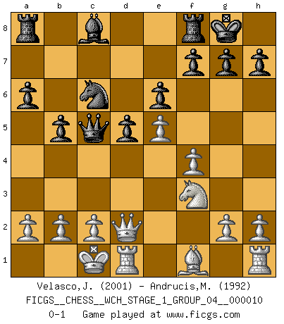 Last move : 0-1 2012 February 17 7:45:34 [Event "FICGS__CHESS__WCH_STAGE_1_GROUP_04__000010"] [Site "FICGS"] [Date "2012.01.01"] [Round "1"] [White "Velasco,Jose Maria"] [Black "Andrucis,Maris"] [Result "0-1"] [WhiteElo "2001"] [BlackElo "1992"] 1.e4 e6 2.d4 d5 3.Nc3 Nf6 4.Bg5 Be7 5.e5 Nfd7 6.Bxe7 Qxe7 7.f4 a6 8.Nf3 c5 9.dxc5 Nc6 10.Qd2 O-O 11.Na4 Nxc5 12.Nxc5 Qxc5 13.O-O-O b5 0-1 This chess game has been lost on time (started : 2012.01.01 23:14:7) French : Classical, Steinitz variation Kingside Castling by player Black (move 10) Queenside Castling by player White (move 13) Player Black won this chess game. Follow this game move after move (download)Chess holds its master in its own bonds, shackling the mind and brain so that the inner freedom of the very strongest must suffer. (Albert Einstein) Die größte Kunst beim Schach besteht darin dem Gegner nicht zu zeigen was er tun kann. (Garry Kasparov) Una clavada es mas poderosa que una espada. (Fred Reinfeld) Les pièces de l'échiquier étaient impitoyables. Elles le retenaient, elles l'absorbaient. Il y avait de l'horreur en cela, mais aussi une harmonie unique. Car, qu'y a-t-il dans le monde, à part les échecs ? (V. Nabokov) When you stop learning you start dying. (Scott Adams)