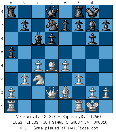 Last move : 0-1 2012 February 19 19:47:30 [Event "FICGS__CHESS__WCH_STAGE_1_GROUP_04__000010"] [Site "FICGS"] [Date "2012.01.01"] [Round "1"] [White "Velasco,Jose Maria"] [Black "Ropokis,Dimitrios"] [Result "0-1"] [WhiteElo "2001"] [BlackElo "1766"] 1.e4 c5 2.Nf3 g6 3.d4 Bg7 4.c4 cxd4 5.Nxd4 Nc6 6.Be3 Nf6 7.Nc3 O-O 8.Be2 d6 9.O-O Bd7 10.Qd2 Nxd4 11.Bxd4 Bc6 12.f3 a5 13.b3 Nd7 0-1 This chess game has been lost on time (started : 2012.01.01 23:14:7) Sicilian : Hungarian variation Kingside Castling by player Black (move 7) Kingside Castling by player White (move 9) Player Black won this chess game. Follow this game move after move (download)In blitz, the Knight is stronger than the Bishop. (Vlastimil Hort) Ich war schon mal beim Dopingtest. Da musste ich Urin abgeben, während Dritte zusahen. (Elisabeth Pähtz) Fischer sacrificó virtualmente todo lo que la mayoría de nosotros los 'debiles' (término que él usa) valoramos, respetamos y apreciamos por el amor de un astuto, a menudo hermoso tablero de juego, por el privilegio ambivalente de ser su mas grande maestro. (Paul Kollar) Le moment que je préfère le plus dans une rencontre, c'est celui où je sens que la personnalité de l'adversaire se brise. (Robert Fischer) It's only after you lost everything, Tyler says, that you're free to do anything. (Chuck Palahniuk, Fight Club)