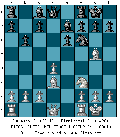 Last move : 0-1 2012 February 18 19:45:51 [Event "FICGS__CHESS__WCH_STAGE_1_GROUP_04__000010"] [Site "FICGS"] [Date "2012.01.01"] [Round "1"] [White "Velasco,Jose Maria"] [Black "Piantadosi,Angelo"] [Result "0-1"] [WhiteElo "2001"] [BlackElo "1426"] 1.e4 e6 2.d4 d5 3.Nc3 dxe4 4.Nxe4 Nd7 5.Nf3 Ngf6 6.Nxf6+ Nxf6 7.Bd3 Be7 8.Bg5 O-O 9.O-O b6 0-1 This chess game has been lost on time (started : 2012.01.01 23:14:7) French : Rubinstein variation Kingside Castling by player Black (move 8) Kingside Castling by player White (move 9) Player Black won this chess game. Follow this game move after move (download)Nonsense was the last thing Fischer was interested in, as far as Chess was concerned. (Elie Agur) Fischer machte Schach einfach zu einer aufregenden Sache, wann immer er sich ans Brett setzte. (Raymond Keene) Vive, pierde y aprende al observar a tu oponente como gana. (Amber Steenbock) Un journaliste : 'Vous préférez avoir une dame de plus sur l'échiquier ou au lit ?' Boris Spassky : 'Ca dépend de la position.' Tree pose grows confidence. It roots me to this world. (Terri Guillemets)