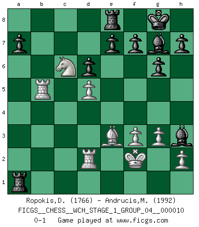 Last move : 0-1 2012 March 12 8:33:45 [Event "FICGS__CHESS__WCH_STAGE_1_GROUP_04__000010"] [Site "FICGS"] [Date "2012.01.01"] [Round "1"] [White "Ropokis,Dimitrios"] [Black "Andrucis,Maris"] [Result "0-1"] [WhiteElo "1766"] [BlackElo "1992"] 1.d4 Nf6 2.c4 g6 3.Nf3 Bg7 4.g3 c5 5.Bg2 cxd4 6.Nxd4 Nc6 7.Nc3 Ng4 8.e3 Nge5 9.b3 d6 10.O-O Nxd4 11.exd4 Bg4 12.f3 Nc6 13.Be3 Bf5 14.Qd2 Qa5 15.Rf2 O-O 16.a3 Rfe8 17.Nd5 Qxd2 18.Rxd2 Rac8 19.Rad1 Na5 20.Ra2 Nxb3 21.Rb2 Na5 22.Bf1 Be6 23.Rb4 b5 24.Rxb5 Nxc4 25.Bxc4 Rxc4 26.Nb4 Rc3 27.Kf2 Rxa3 28.d5 Bh3 29.Nc6 Ra2+ 30.Rd2 Ra1 0-1 This chess game has been lost on time (started : 2012.01.01 23:14:7) King's Indian, 3.Nf3 Kingside Castling by player White (move 10) Kingside Castling by player Black (move 15) Player Black won this chess game. Follow this game move after move (download)We cannot resist the fascination of sacrifice, since a passion for sacrifices is part of a Chessplayer's nature. (Rudolf Spielman) Später, ... hatte ich zunehmend Erfolg in entscheidenden Partien. Vielleicht weil ich eine einfache Wahrheit erkannte: nicht nur ich hatte Angst, auch mein Gegner. (Mikhail Nekhemyevich Tal) El Ajedrez se juega con la mente... ¡no con las manos!. (Renaud y Kahn) Il n'y a pas de prix trop élevé au scalp de l'ennemi. (Koblentz) The message for business people contemplating their place in the cyberspace is simple and direct: get linked or get lost. (Vic Sussman and Kenan Pollack)