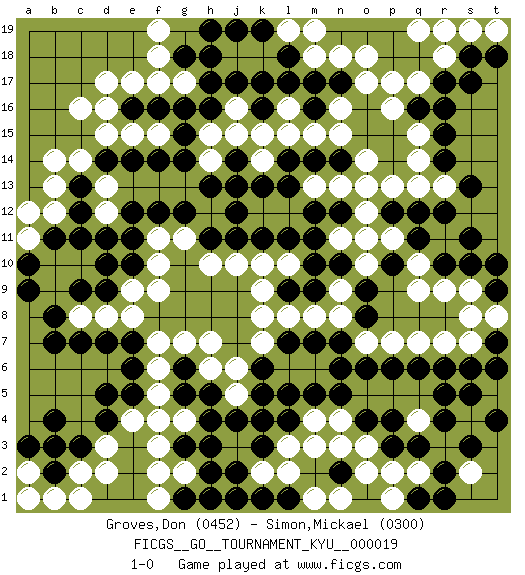 Last move : 1-0 2007 August 28 18:36:5 [Event "FICGS__GO__TOURNAMENT_KYU__000019"] [Site "FICGS"] [Date "2007.01.11"] [Round "1"] [Black "Groves,Don"] [White "Simon,Mickael"] [Result "1-0"] [Rating 1 "0452"] [Rating 2 "0300"] 1.q3 q17 2.d4 c16 3.r6 e17 4.r15 c10 5.c7 f3 6.h3 f5 7.h5 d2 8.c3 f7 9.e6 f6 10.e5 k17 11.r17 r18 12.r16 p17 13.q12 h7 14.k6 q9 15.o9 p11 16.p12 p7 17.n7 r11 18.r12 r7 19.q6 q7 20.p6 o11 21.q11 q10 22.r10 r9 23.s10 o12 24.p10 n9 25.o8 o7 26.o6 n8 27.n10 o10 28.m9 m8 29.m7 l8 30.m10 k8 31.m12 n13 32.n12 o14 33.j12 k10 34.k11 l10 35.l11 n11 36.m11 o13 37.l14 j15 38.j14 h14 39.h13 k14 40.j13 k15 41.k13 m13 42.l13 h10 43.g14 h15 44.f12 d13 45.f14 l6 46.l7 k7 47.l5 j6 48.k5 j5 49.j4 d8 50.d7 e8 51.h11 g11 52.g12 f11 53.e12 d12 54.e11 f10 55.e14 d15 56.f16 f17 57.g16 g17 58.h16 f15 59.g15 e15 60.h17 l15 61.g18 f18 62.h18 j10 63.j11 s9 64.s11 q14 65.r14 c2 66.b2 d3 67.b4 g2 68.h2 g4 69.h4 e4 70.d5 r3 71.r4 s4 72.s5 q4 73.r5 q2 74.p3 s2 75.t4 p2 76.s3 o3 77.p4 n3 78.r2 m3 79.l1 l3 80.k4 k2 81.k1 j1 82.h1 m1 83.j2 l2 84.q1 o2 85.n2 p1 86.r1 n1 87.j1 m6 88.n6 q15 89.e10 f9 90.c9 c8 91.d9 b9 92.b7 k18 93.g1 f1 94.d14 c14 95.e16 d16 96.m14 m15 97.b8 b10 98.s18 q19 99.d11 s19 100.t18 s7 101.c11 b12 102.b11 a11 103.c12 b13 104.c13 b1 105.d10 b14 106.a9 q13 107.n14 n15 108.q16 r13 109.s13 a2 110.b3 p16 111.j19 j18 112.k19 l19 113.h19 h6 114.l18 m19 115.l17 m18 116.m17 n18 117.n17 o18 118.k16 n16 119.g3 f2 120.g5 f4 121.k3 n4 122.n5 d17 123.o4 p13 124.t9 t8 125.t10 a12 126.a10 o17 127.l9 k9 128.g6 g7 129.t6 j16 130.j17 l16 131.k17 f19 132.t7 s8 133.s6 r19 134.m16 c1 135.a3 t19 136.s17 a1 137.e7 e9 138.l4 m4 139.m5 1-0 Here are the names of the openings (joseki) played in the four corners : Corner q16 : q17 r15 Komoku (Somok, Xiao~mu`) 3-4 Point. The komoku (3-4) point is the traditional corner enclosure move.. Ikken Kakari (Hankan Keolch'im, Yi Gua`jiao~, 1-Space Low Pincer). The small knight move is the basic approach move to the 3-4 point stone. It has been continually used for over four centuries. There are limitless variations, with new moves constantly being discovered. Black 2 opens the door to a treaure store of joseki. Player Black won this Go (weiqi, baduk) game. Follow this game move after move (download)On the third line, four die, six live. (Anonymous) If you are good, you will be assigned all the work. If you are really good, you will get out of it. (Dan Rotaru)