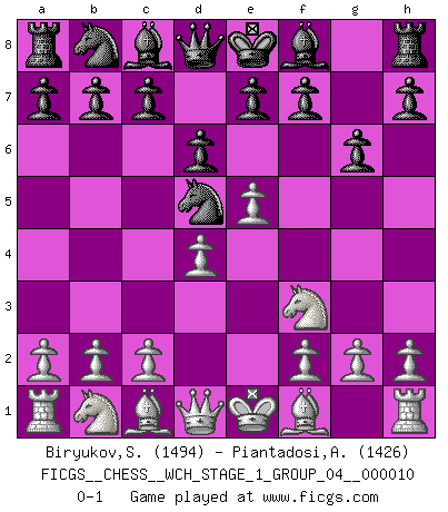 Last move : 0-1 2012 February 9 7:17:18 [Event "FICGS__CHESS__WCH_STAGE_1_GROUP_04__000010"] [Site "FICGS"] [Date "2012.01.01"] [Round "1"] [White "Biryukov,Sergey"] [Black "Piantadosi,Angelo"] [Result "0-1"] [WhiteElo "1494"] [BlackElo "1426"] 1.e4 Nf6 2.e5 Nd5 3.d4 d6 4.Nf3 g6 0-1 This chess game has been lost on time (started : 2012.01.01 23:14:7) Alekhine's defense : Modern, Fianchetto variation Player Black won this chess game. Follow this game move after move (download)First-class players lose to second-class players because second-class players sometimes play a first-class game. (Siegbert Tarrasch) Schach ist Krieg, im Schach geht es um testosterongesteuerte Urschreie. (Garry Kasparov) No puedes jugar al Ajedrez si eres de corazón noble. (Proverbio Francés) Je ne suis pas le dernier à jouer lâchement des coups douteux pendant le zeïtnot de l'adversaire pour l'achever: en effet les coups qui font le plus peur sont ceux que l'on ne comprend pas. Je me fais souvent peur quand je joue. (Un professeur anonyme) Life is like a ten-speed bicycle: most of us have gears we never use. (Charles M. Schulz)